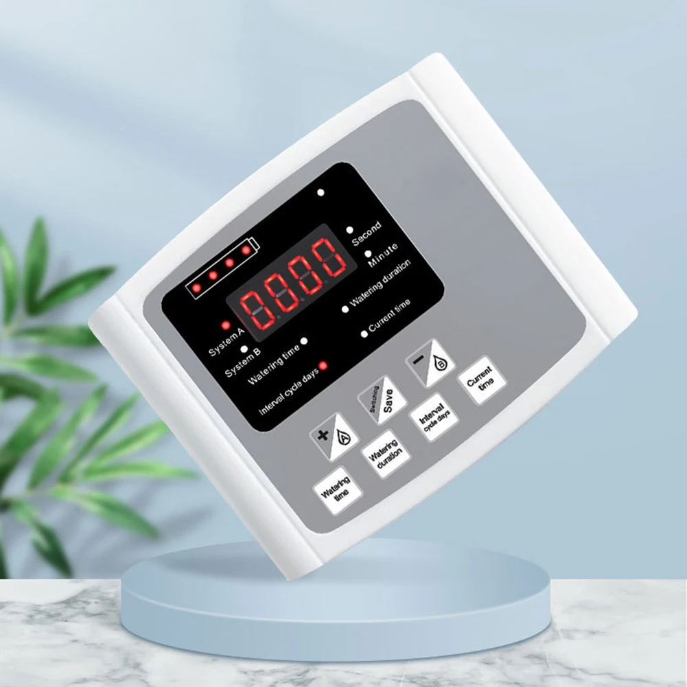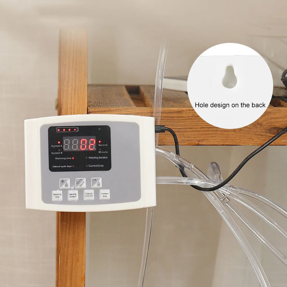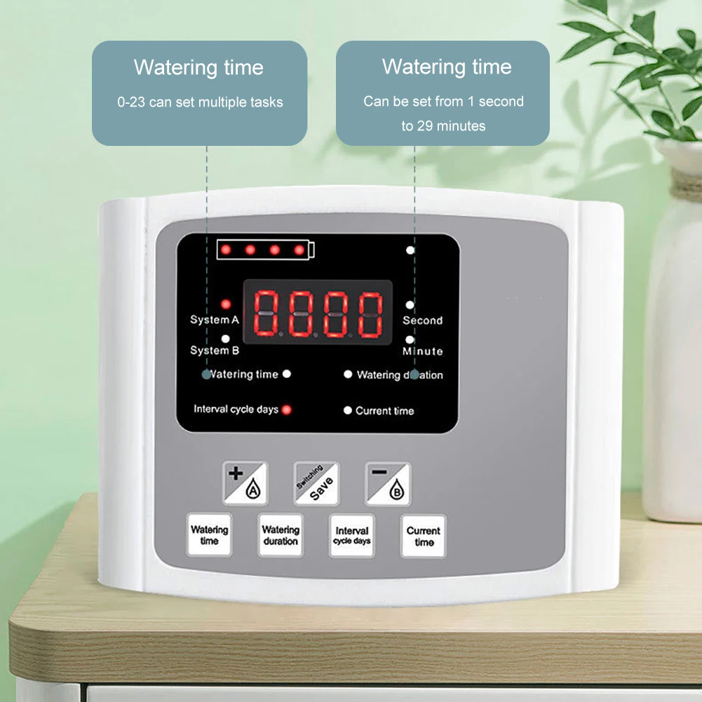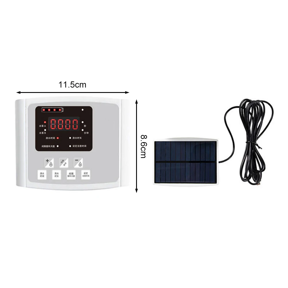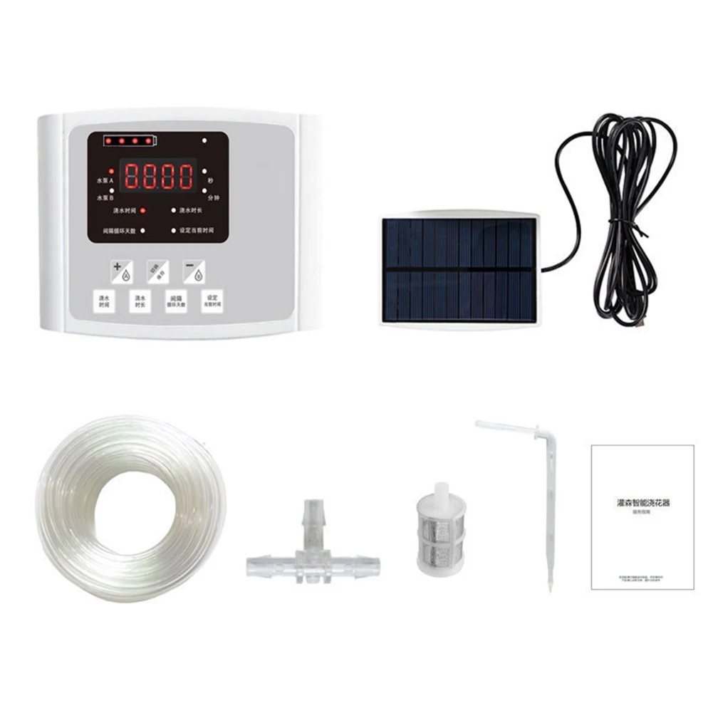 Feature: Solar smart watering, English voice prompts. Can be hung behind the design. No faucet, safe and reliable. Two modes of manual and automatic timing. Easy to install and easy to operate. It can irrigate multiple plants at the same time. Garden drip irrigation device, dual pump controller, timer system, solar intelligent automatic watering device. The products have CE certification, safe and reliable, factory direct sales, good quality and low price. Can be authorized to sell to the local country agent. Common problem: 1. Long press the two buttons "watering time" and "interval period days" to switch between dual pump/single pump mode. 2. Chinese and English voice, long press the two keys "+" and "-" to switch languages. 3. Long press the "Switch/Save" button for 7 seconds to restore the factory settings. 4. When the battery is fully charged, the feed water pump can run for about 90 minutes. 5. If the battery indicator has only 3 indicator lights flashing, you can remove the data cable and then reinsert it. 6. If the battery can only be charged to 3 batteries, please don't worry, because the battery has not been used for a long time, the battery is not activated, and it will return to normal after multiple uses. Specification: Host size: length 11.5cm, width 8.6cm, height 4.6cm Power supply: USB charging, solar panel, built-in lithium ion battery Battery capacity: 1200ma Voltage: 5V Number of pumps: 1/2pcs Interval days: 1-9999 days Watering frequency: 1-24 times a day Watering time: 1 second-24 minutes Style pump: Sing/Double Including accessories: host, solar panel, PVC transparent water pipe, tee, PP water pipe Tip: When you receive the package, please charge it with a mobile phone charger for 2 hours, and press and hold the "Save" button to open it. Note: 1. Due to the different monitor and light effect, the actual color of the item might be slightly different from the color showed on the pictures. Thank you! 2. Please allow 1-2cm measuring deviation due to manual measurement.