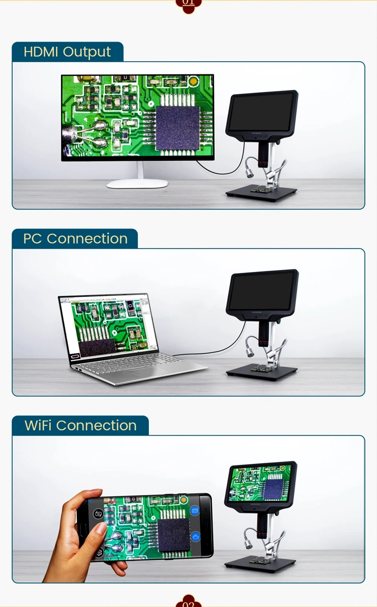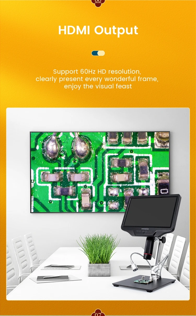 1080P и 60f: промышленные оптические линзы и датчик 4 МП обеспечивают увеличение до 270 раз и разрешение записи видео до 1080P и 60f. Микроскоп работает быстро и имеет гораздо меньшую задержку. 60 кадров в секунду позволяет запечатлеть все ваши движения под объективом.