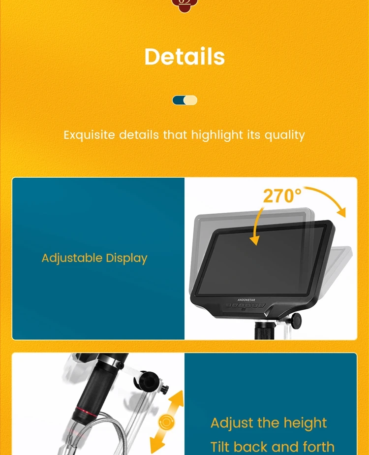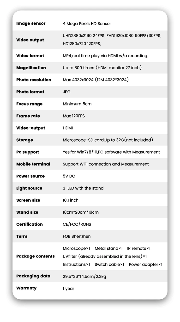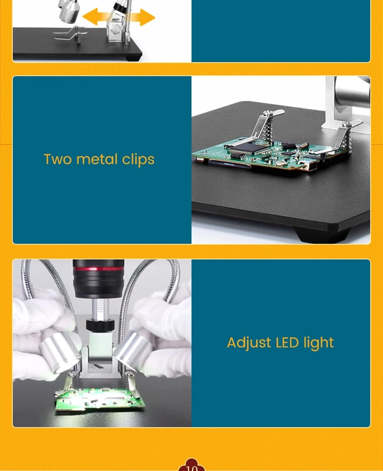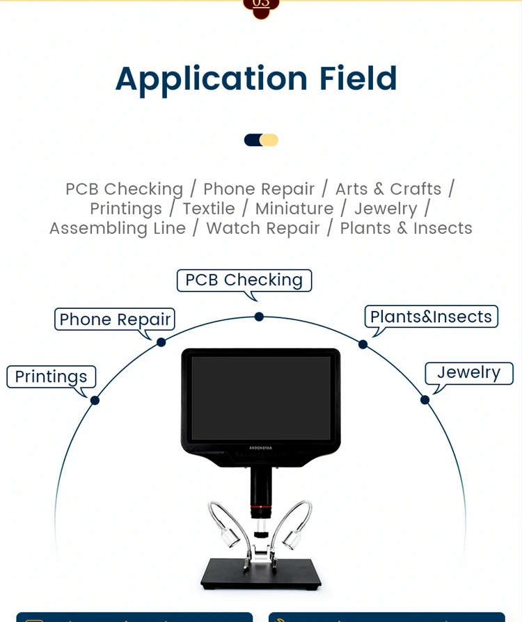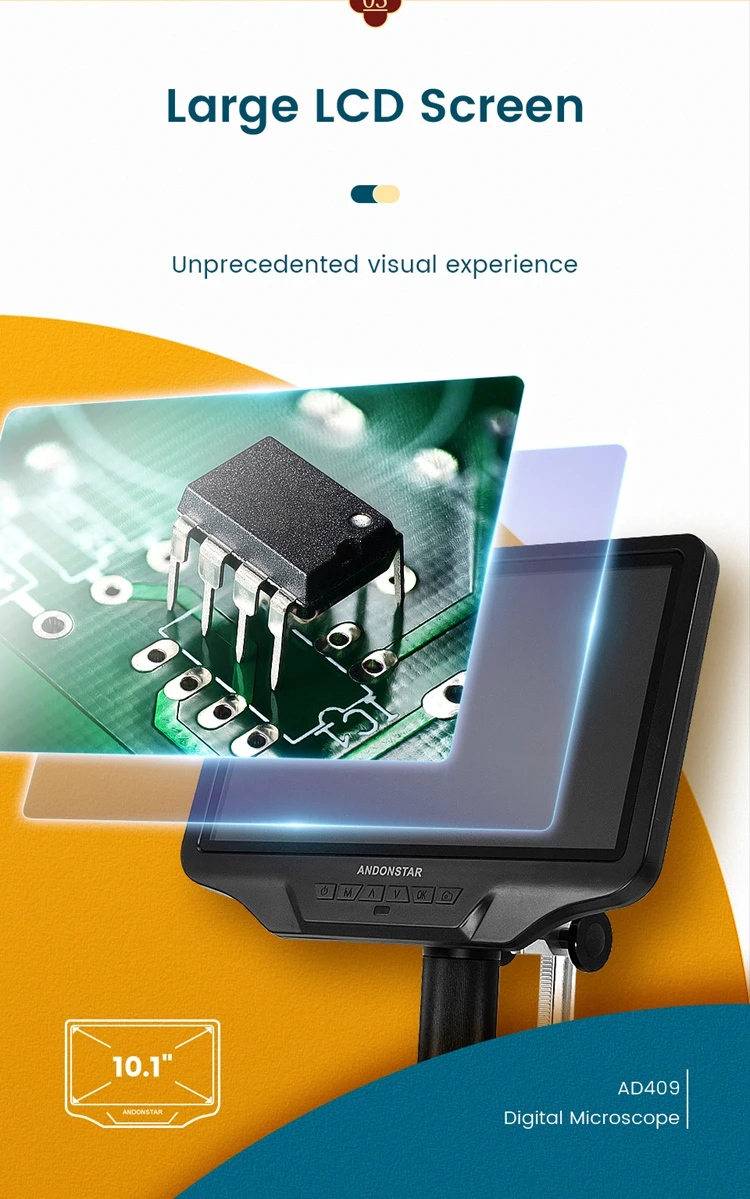 10,1 дюймов ЖК-дисплей: 10,1 дюймов дисплей приносит вам идеальный визуальный опыт. Для большинства людей больше не требуется внешний дисплей, сам микроскоп может удовлетворить все их визуальные требования.