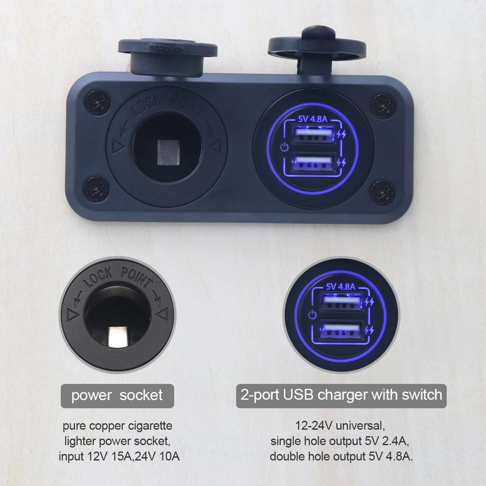 Автомобильный USB-выход: 5 В 4,8 А (2,4 А + 2,4 А)