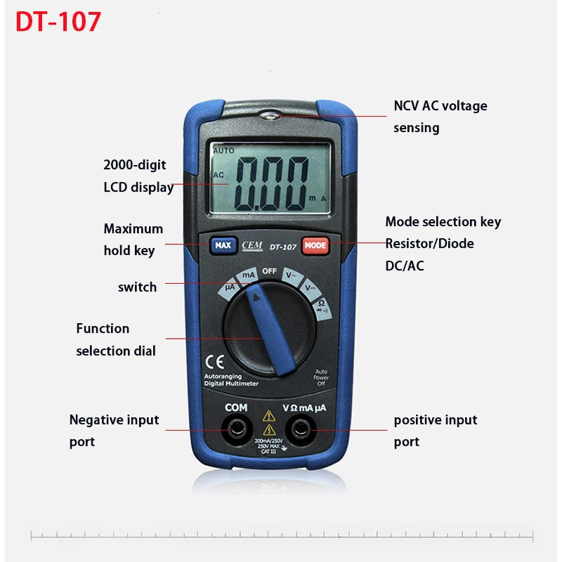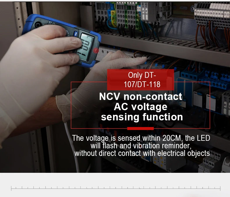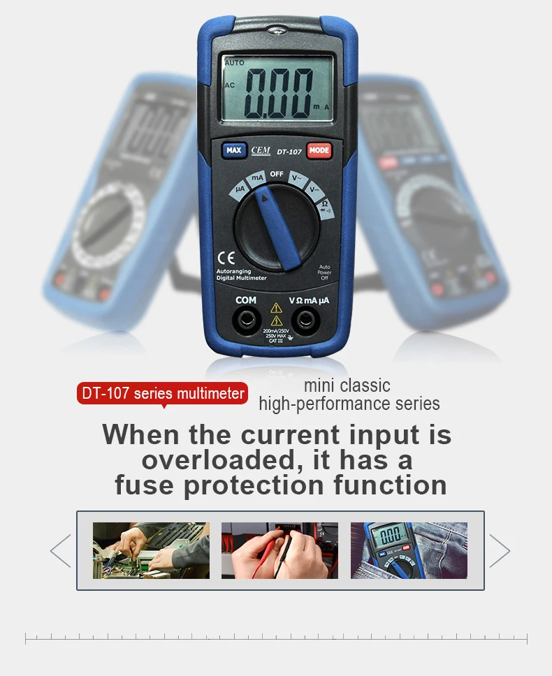 DT-107/DT111/DT118 Карманный автоматический мультиметр использует эксклюзивную технологию чипа CEM с безопасной и надежной производительностью. Когда входной ток перегружен, он имеет функцию защиты предохранителя. Он автоматически мерцает, когда напряжение ощущается в пределах 20 см, и светодиодный светильник будет вибрировать как напоминание, без прямого контакта с заряженными предметами, подходит для нескольких сценариев.