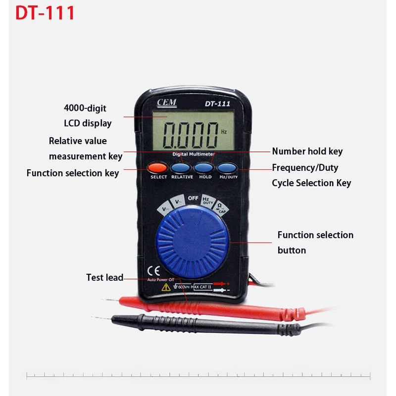 DT-107 данных DT-111 DT-118 ЖК цифры 2000 4000 2000 Напряжение постоянного тока √ Напряжение переменного тока √ DC √ Переменный ток √ Электричество мешает √ Рабочий цикл √ Частота √ Содержание электроэнергии √ Тест на диод √ Тест на зуммер короткого замыкания √ Чехол для машины для литья под давлением с двумя стрелками √ Полная защита всех диапазонов Хранение данных √ Автоматическое отключение Функция NCV √