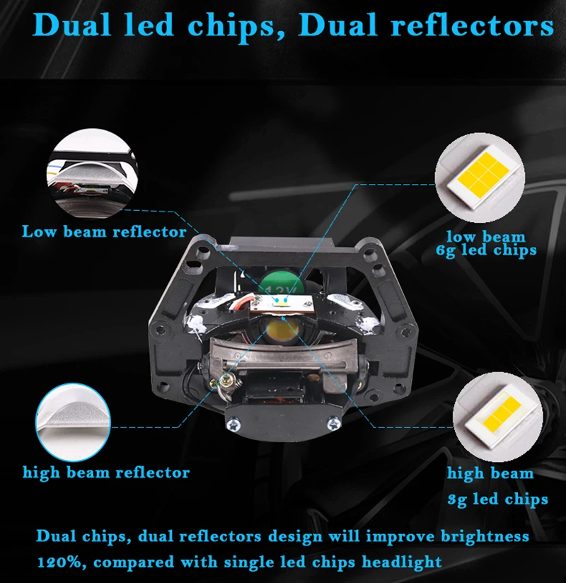 Двойные отражатели, две чипы дизайн: принять 6g светодиодные чипы как ближний свет, 2g светодиодные чипы как дальнего света; Также принять 2 отражателя. Такой дизайн улучшит яркость на 120% по сравнению с линзами для проектора с одним чипом