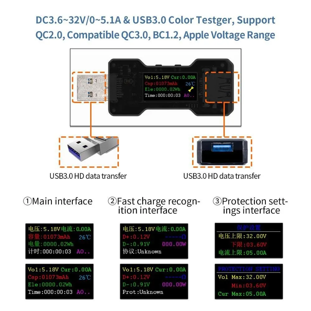 Используйте цветной монитор USB3.0, чтобы безопасно заряжать мобильный телефон, отслеживать данные зарядки в режиме реального времени, поддержка QC3.0 (3,8-12 В, +/-0,2 шаг) И поддержка QC2.0 (5 В/9 В/12 В/20 в), Android BV1.2 (5 В), ios 5V/2.4A и MTK-PE (5V/7 Вт/9 В/12 В) и других высоких частот быстрой зарядки Диапазон напряжения зарядки транспортными средствами измерения, легко и безопасно измерять.