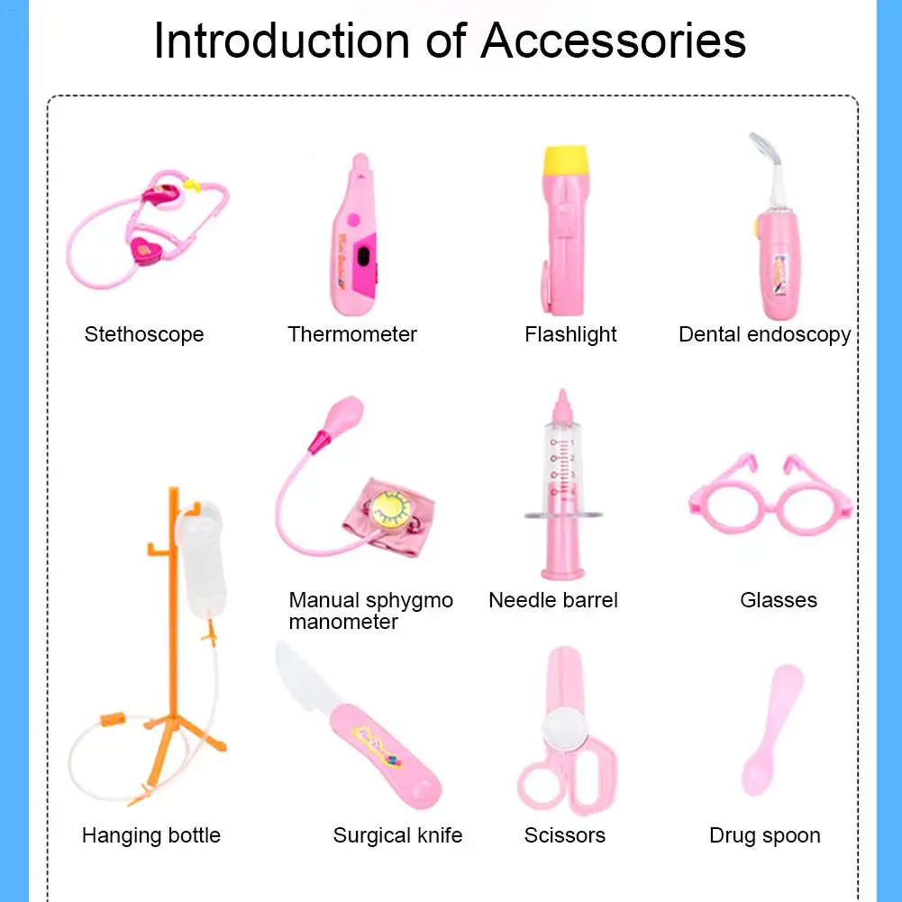 1. Посылка включает в себя: посылка включает в себя 15 различных инструментов и комплектов для ролевых игр для стоматологов, докторов и медсестер. Стетоскоп с сердцебиением, отоскоп и стоматологическое зеркало с светильник позволяют ребенку показать сцену и сделать опыт более реалистичным.2. Инструменты доктора: делая вид, что он является врачом, а не пациентом через это медицинское устройство, дайте вашему ребенку знать весь процесс.3. Эргономичный дизайн: Научите детей развивать чувство сочувствия и заботы о себе и других. Все инструменты эргономично разработаны для удобной переноски и хранения.4. Широкое Применение: подходит для использования в помещении и на открытом воздухе, путешествий, отпуска и на ночь! Каждый инструмент имеет различную цель для вашего ребенка. Помогите вашему ребенку изучить различные виды использования каждого медицинского инструмента с помощью интерактивных игр.5. Материал Премиум-качества: Этот набор игрушек изготовлен из экологически чистых и безопасных для детей пластмасс, поэтому вам не придется беспокоиться о безопасности мальчиков и девочек. Это лучший подарок для детей старше 3 лет.Спецификация:Название: Новый комплект медицинского оборудования из 15 предметовРазмер: около 21*9*19 см/8,27*3,54*7,48 дюймовАксессуары продукта: медицинская коробка, стетоскоп, фонарик, термометр, стоматологическое зеркало, ручной сфигмоманометр, хирургический диск, скальпель, ножницы, очки, шприц, медицинская ложка, Медицинская бутылка, подвесная бутылкаУпаковочный лист:Набор из 15 предметов doctor tools/1 Набор