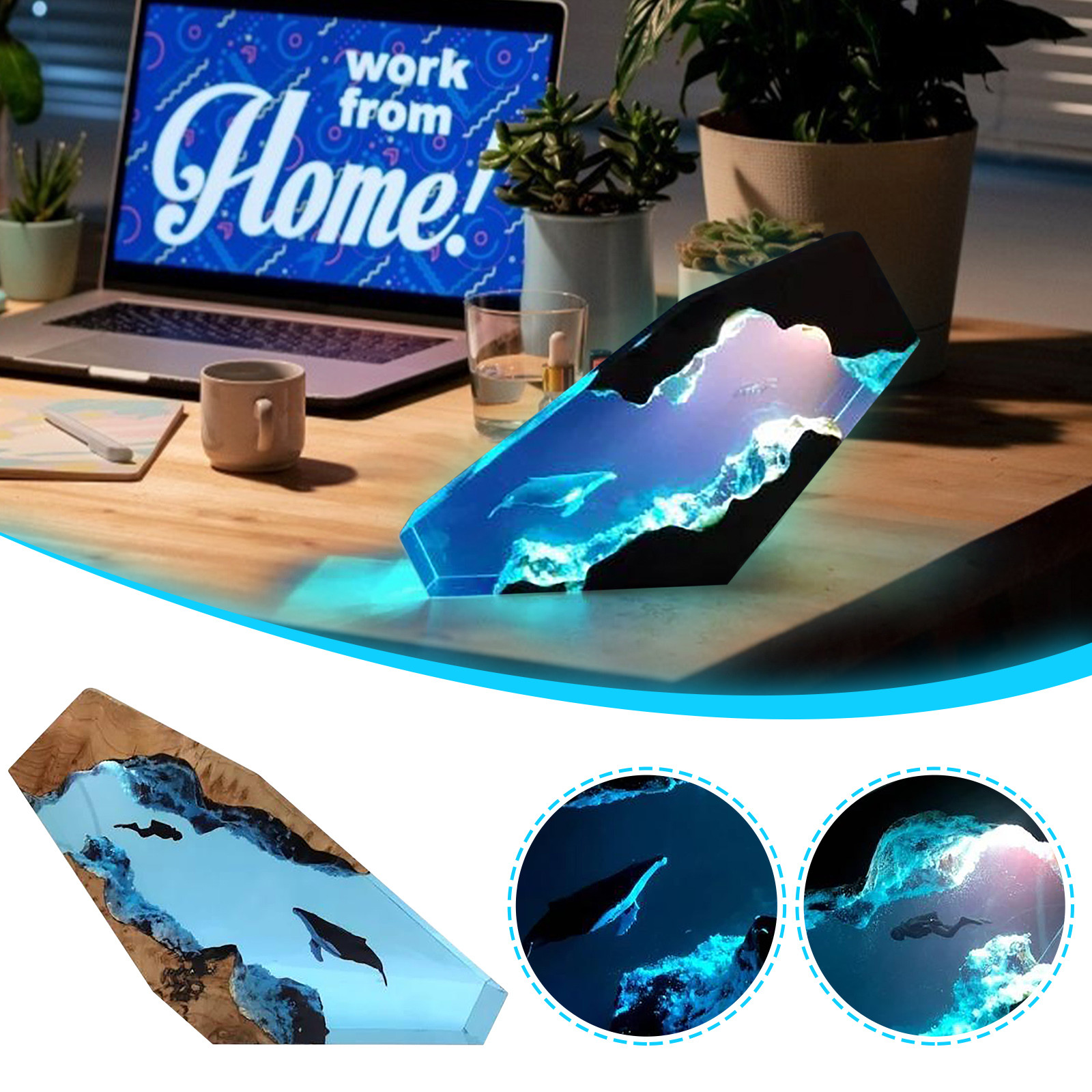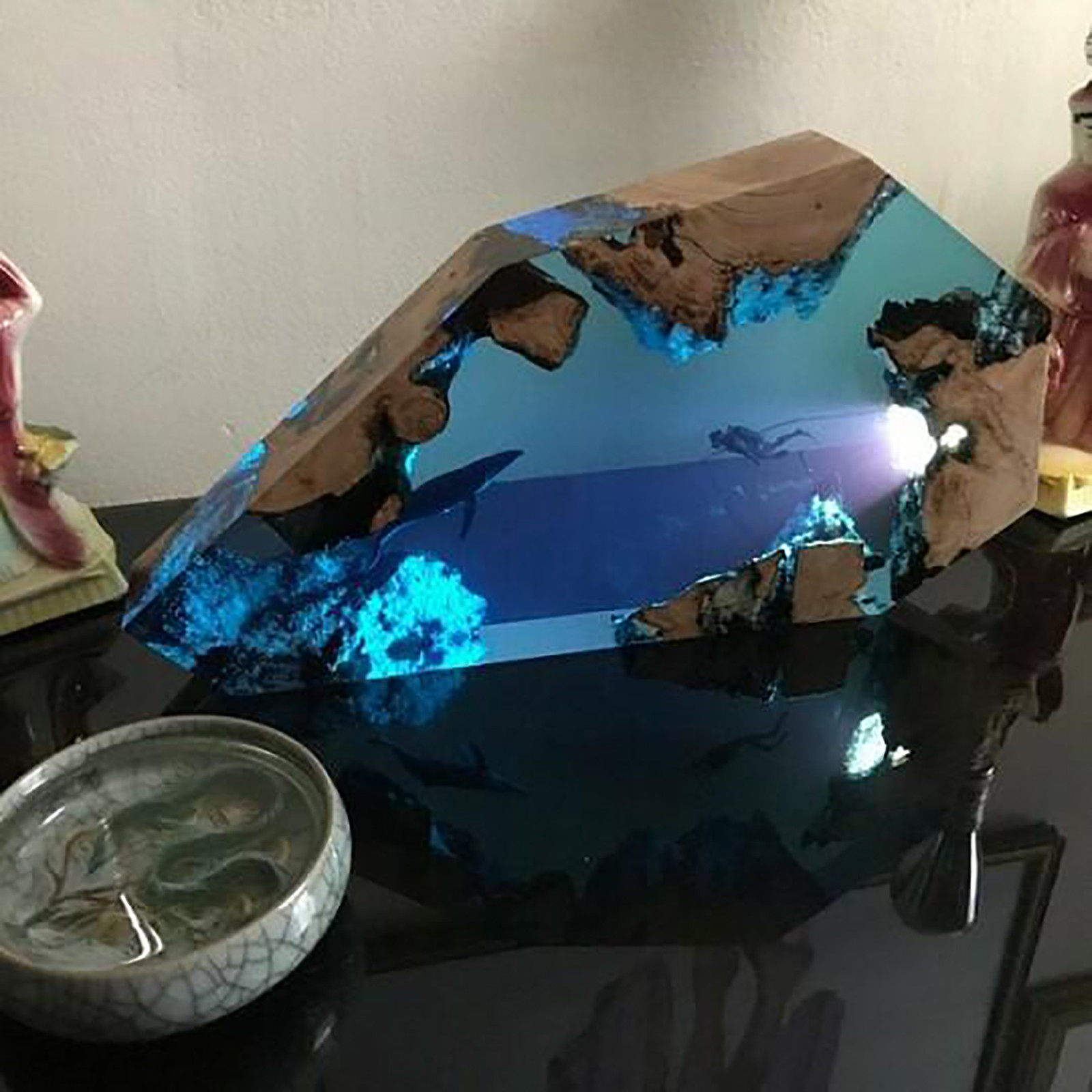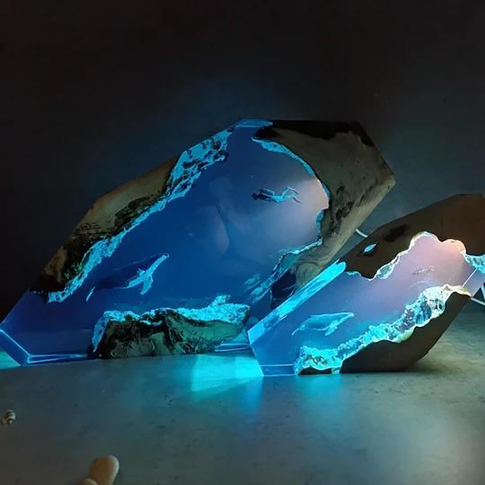Светильник с верхней стороны, освещающий ныряльщиков и китов в пещере. Включение света ночью наполнено этим загадочным цветомБольшая эпоксидная деревянная лампа также может использоваться в качестве настольной лампы, которую можно разместить на столе или дома. Это также хорошее украшение.