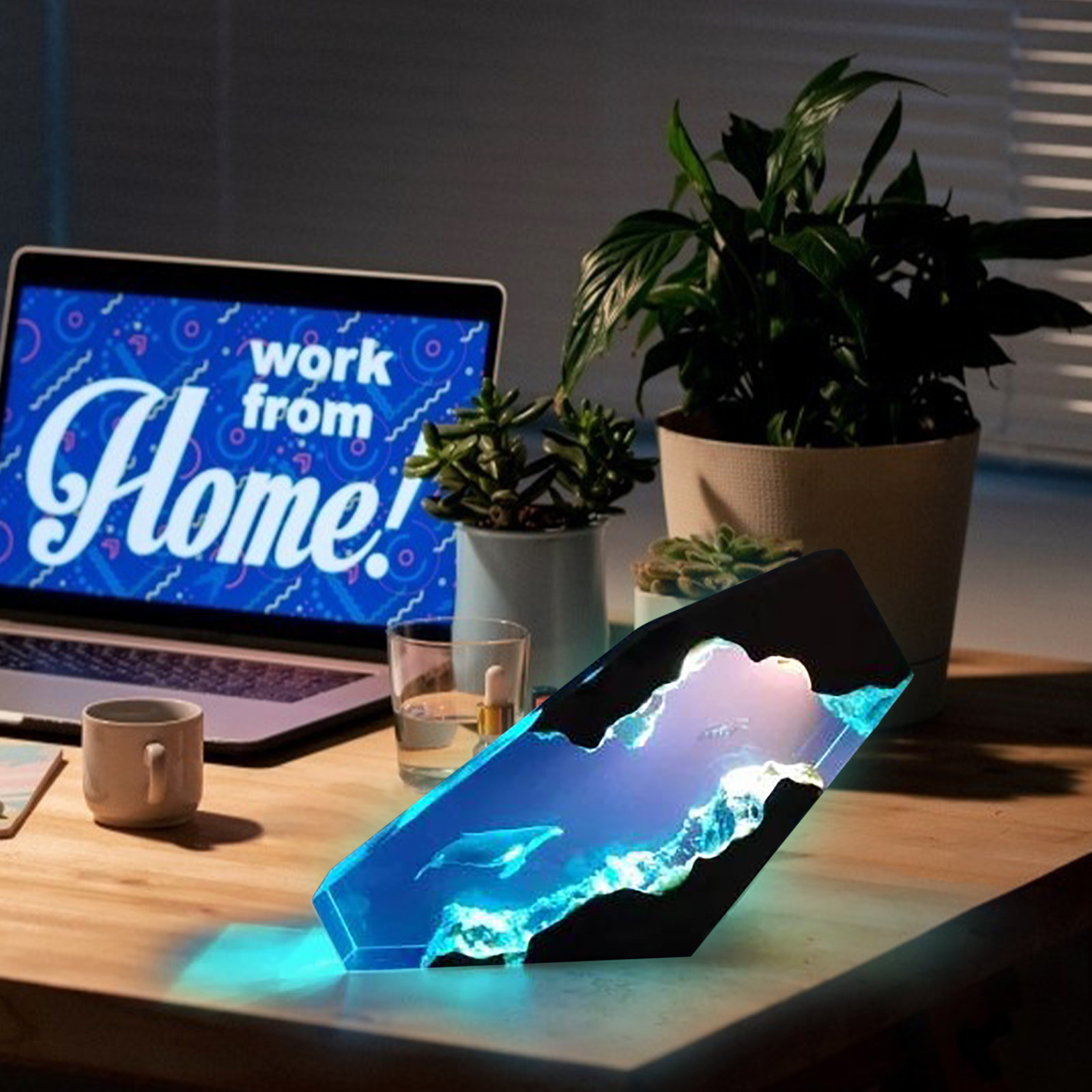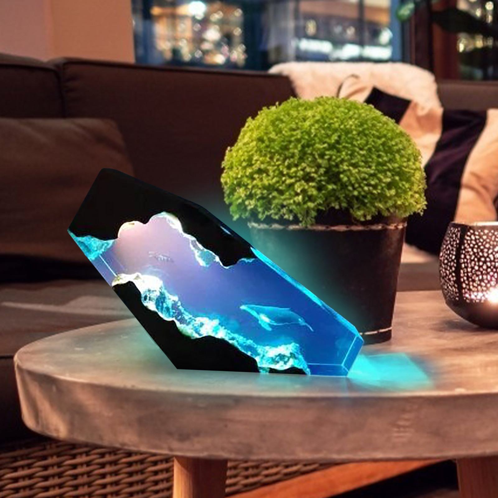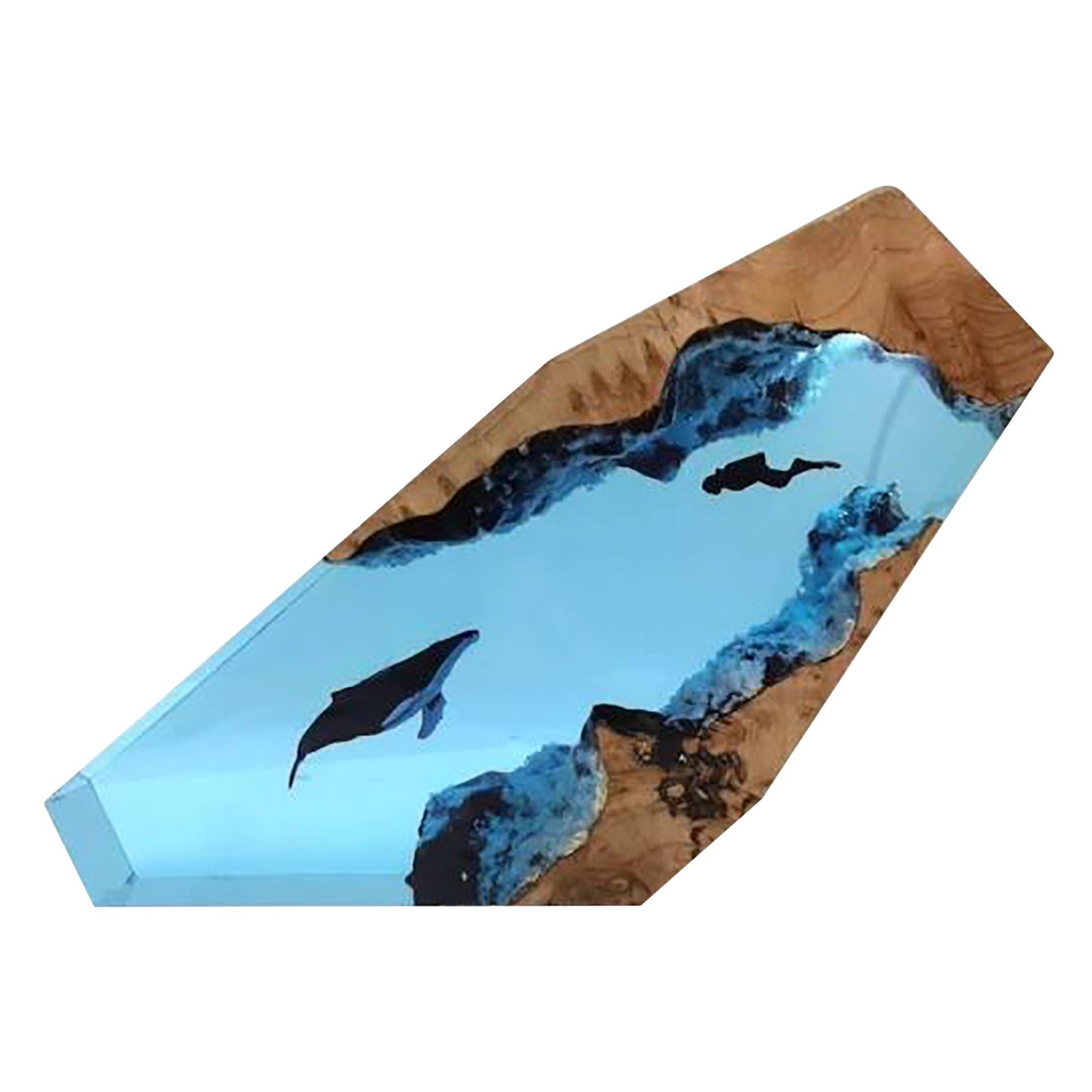 Светильник с верхней стороны, освещающий ныряльщиков и китов в пещере. Включение света ночью наполнено этим загадочным цветомБольшая эпоксидная деревянная лампа также может использоваться в качестве настольной лампы, которую можно разместить на столе или дома. Это также хорошее украшение.
