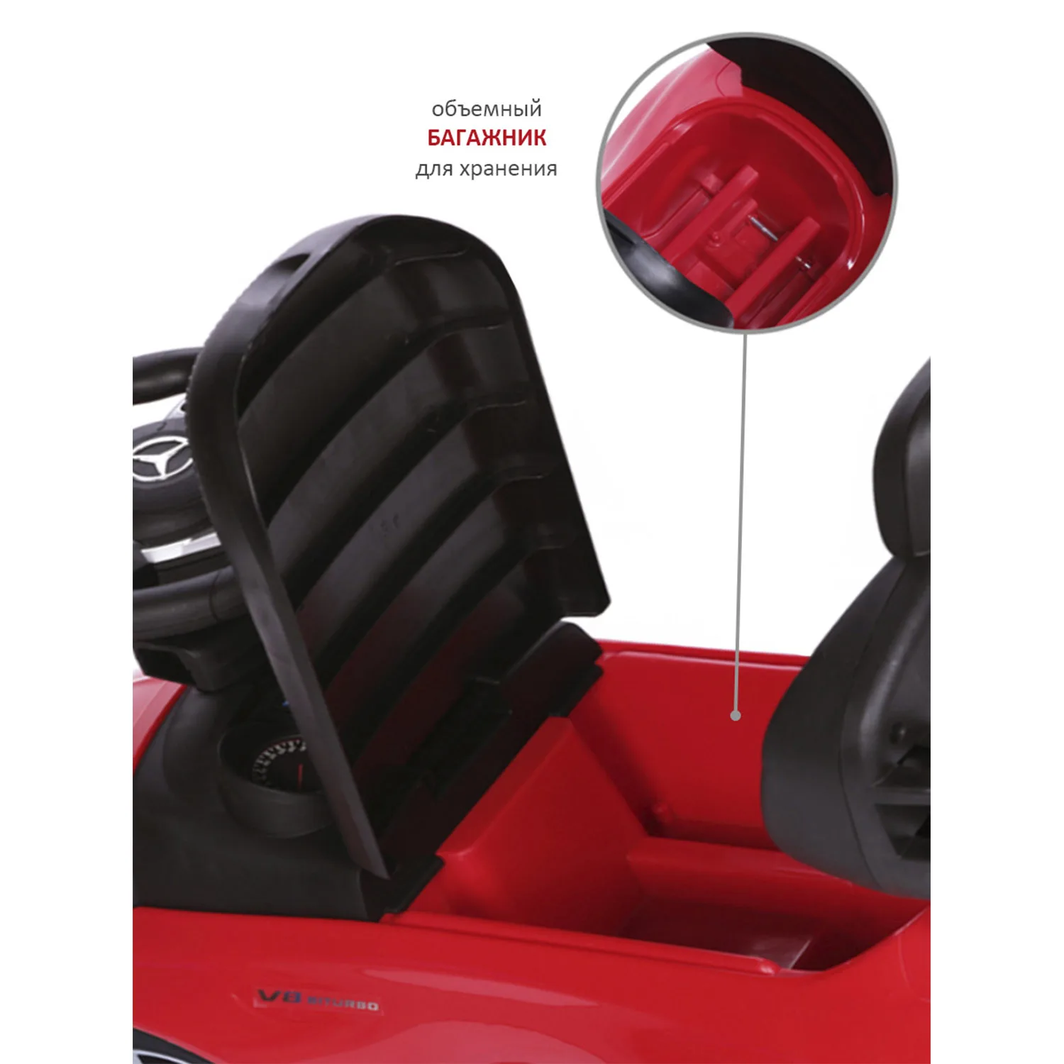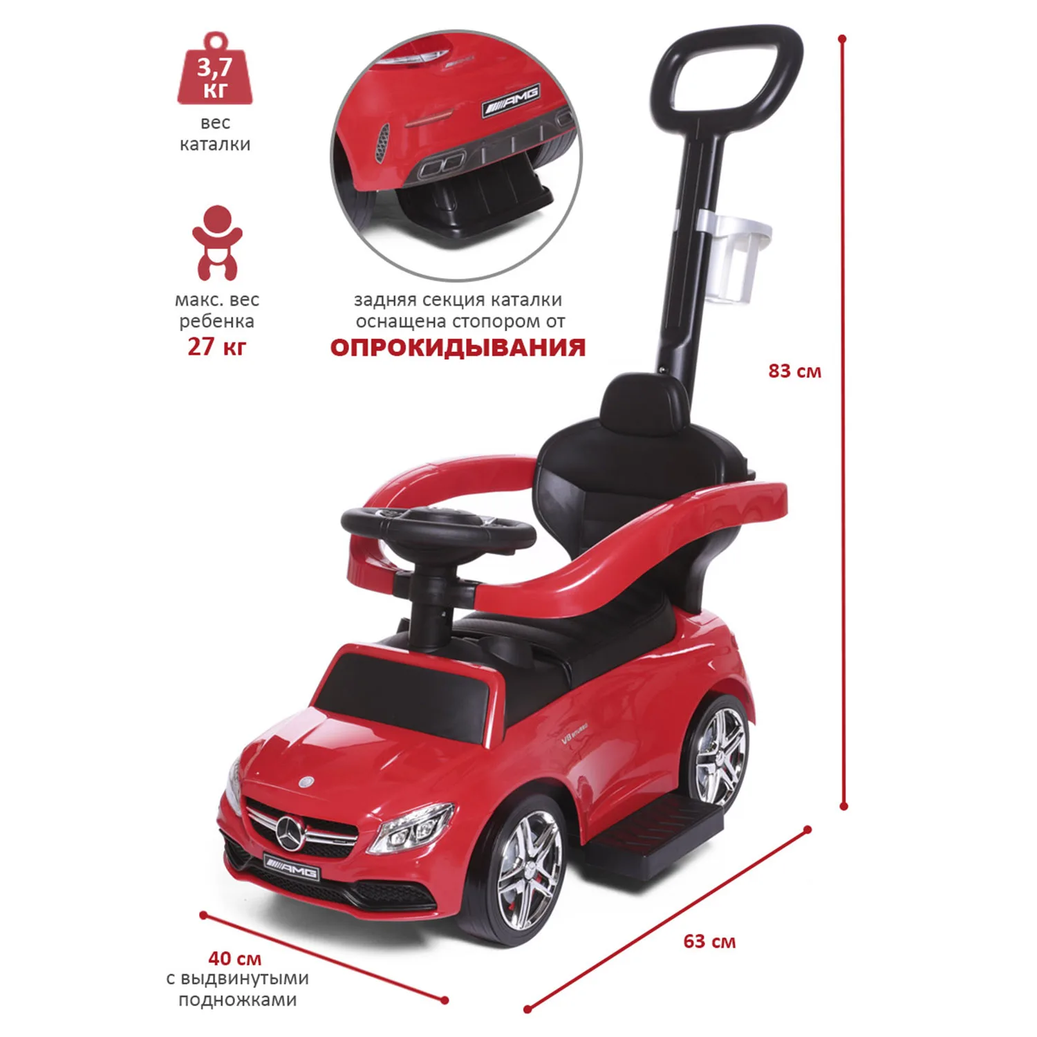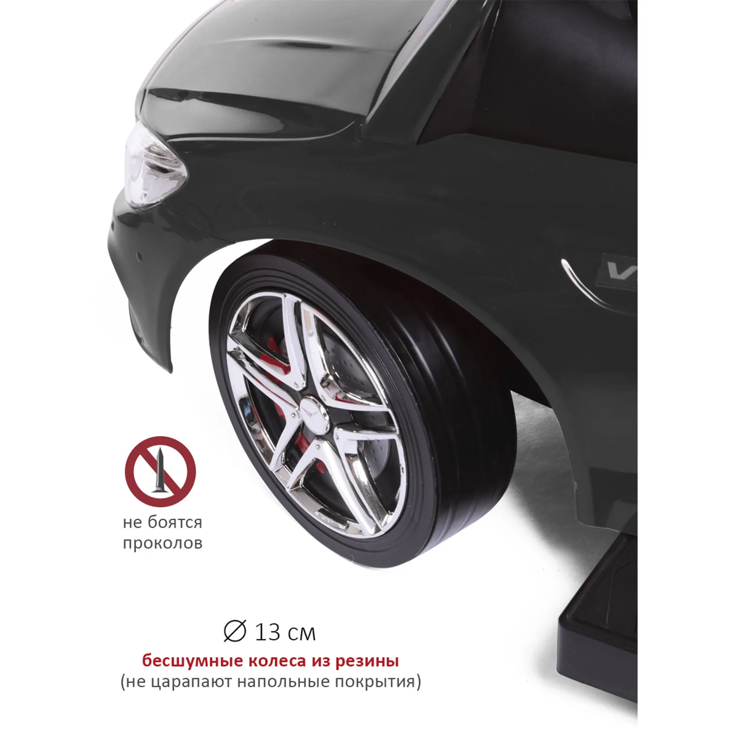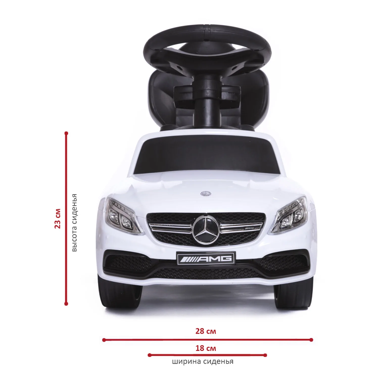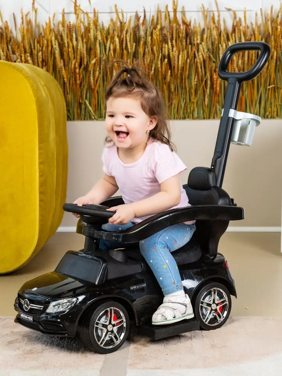 The children's wheelchair Mercedes Benz is executed under the license of the famous brand. Features of the car found their reflection in the children's toy: a streamlined body, headlights (without illumination), radiator grille and the branded emblem of the Mercedes Benz seat, rubber wheels. In the wheelchair there are removable elements: a parent handle with a cup holder and a safety bumper. Wide side pegs easily move inside. Therefore, the machine "grows" with the baby. The parent handle controls the front wheels, which allows you to rotate the wheelchair in different directions. The model does not have sharp corners, it is made of shockproof, hypoallergenic plastic. Special locks in front and behind will protect the wheelchair from tipping. Under the seat is a compartment for storing small things. On the steering wheel there are buttons that reproduce the sound of the running engine, the claxon signal and several melodies. Wheelchair size (with handle): 84x40x83 cm (L x W x H). Seat height from floor level: 23 cm. Weight: 3.7 kg max load: 27 kg. Rubber diameter: Wheels 13 cm.