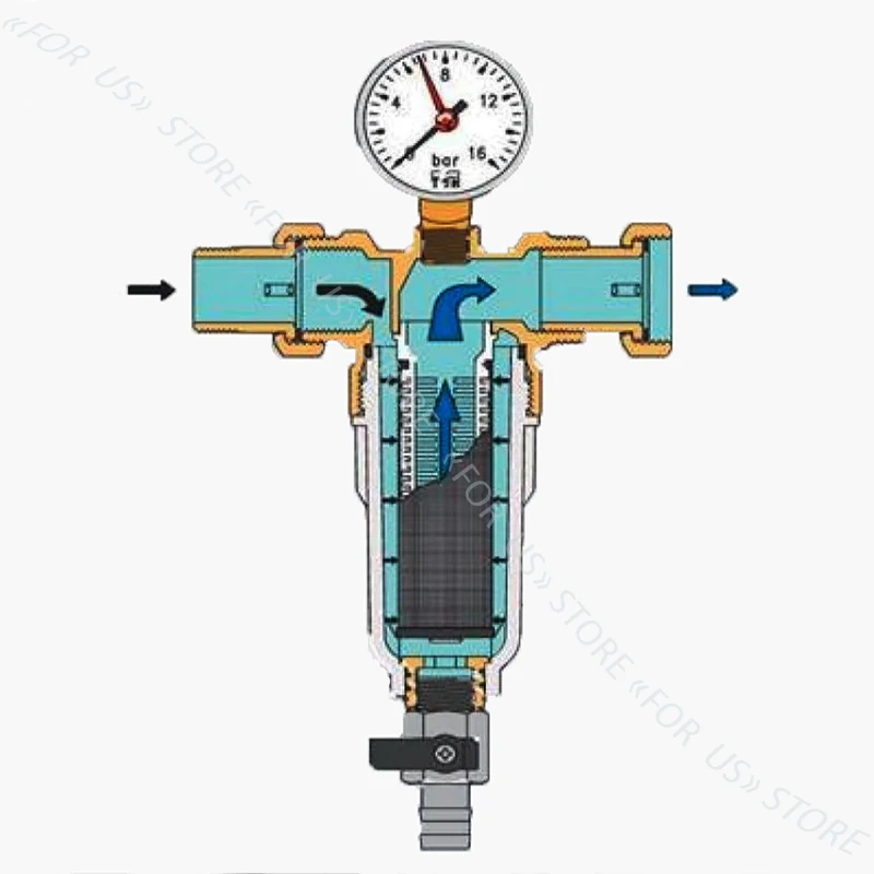Фильтр промывной прямой с манометром и с латунной колбой предназначен для защиты сантехники и бытовой техники подключенную к водоснабжению от возможной поломки в случаи попадания внутрь прибора песка, окалины и прочих крупных частиц. По показанию манометра определяется степень загрязнения фильтра. Скопившаяся в фильтре грязь смывается через сливной вентиль в канализацию. Данный фильтр применяется в жидкой и газообразной среде, не агрессивных