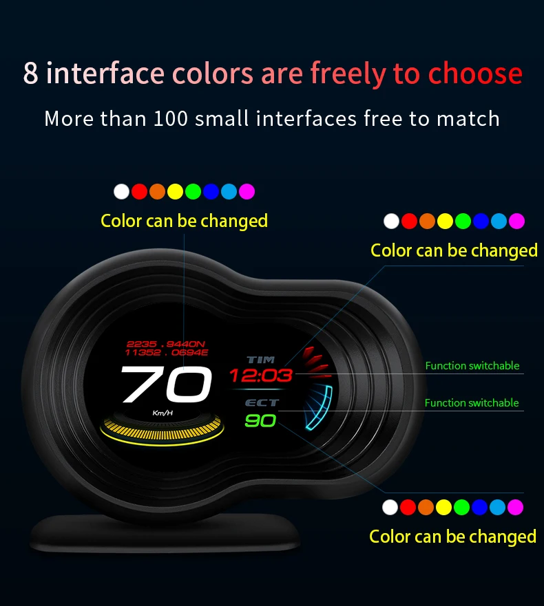 6,8 цветов интерфейса можно свободно выбирать, скорость работы меняется в зависимости от скорости (0-99 белый цвет, 100-119 желтый цвет и красный цвет более 120)