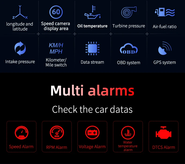 5. Отображение информации: скорость, напряжение батареи, об/мин, температура воды, часы, время вождения, расстояние вождения, расход топлива, высота, номер спутника, индивидуальная навигация, соединение мобильных устройств, значок скоростной камеры, навигационное узкое направление, навигационная линия, долгота и широта, зона отображения скоростной камеры, температура масла, давление турбины, соотношение воздух-топливо, давление на входе, переключатель километров/миль, поток данных, система OBD, система GPS