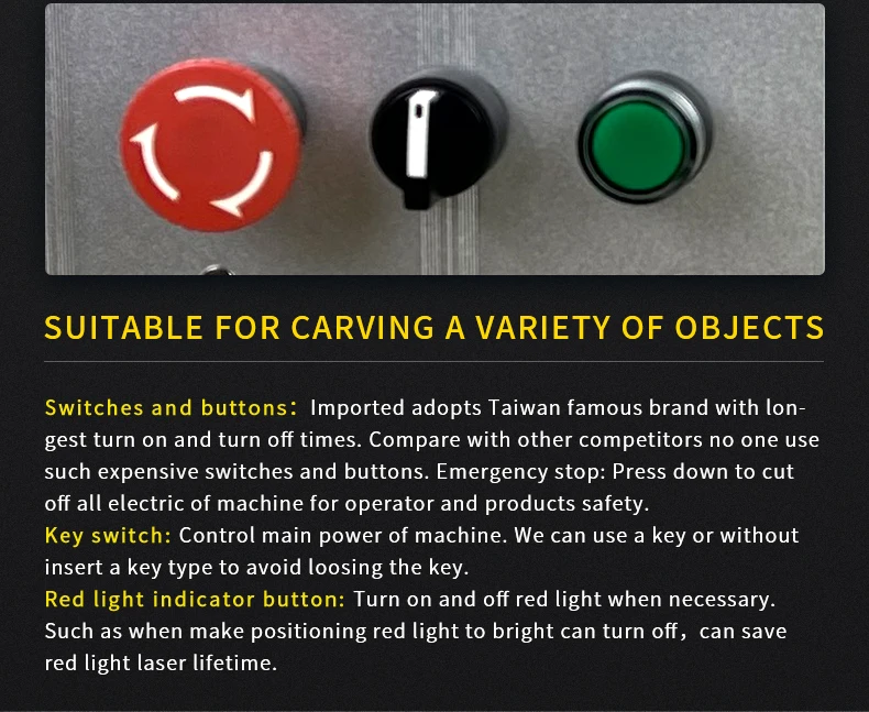 Переключатели и кнопки: импортированные из Тайваня известные бренды с самым длинным временем включения и выключения. По сравнению с другими конкурентами никто не использует такие дорогие переключатели и кнопки. Аварийная остановка: нажмите вниз, чтобы отрезать все электрические машины для безопасности оператора и продуктов. Клавишный переключатель: Управление основной мощностью машины. Мы можем использовать ключ или без вставки типа ключа, чтобы избежать потери ключа. Красный светильник Кнопка индикатора: включить и выключить красный светильник при необходимости. Например, когда вы делаете позиционирование красный светильник яркий может выключить, может сохранить красный светильник срок службы лазера.