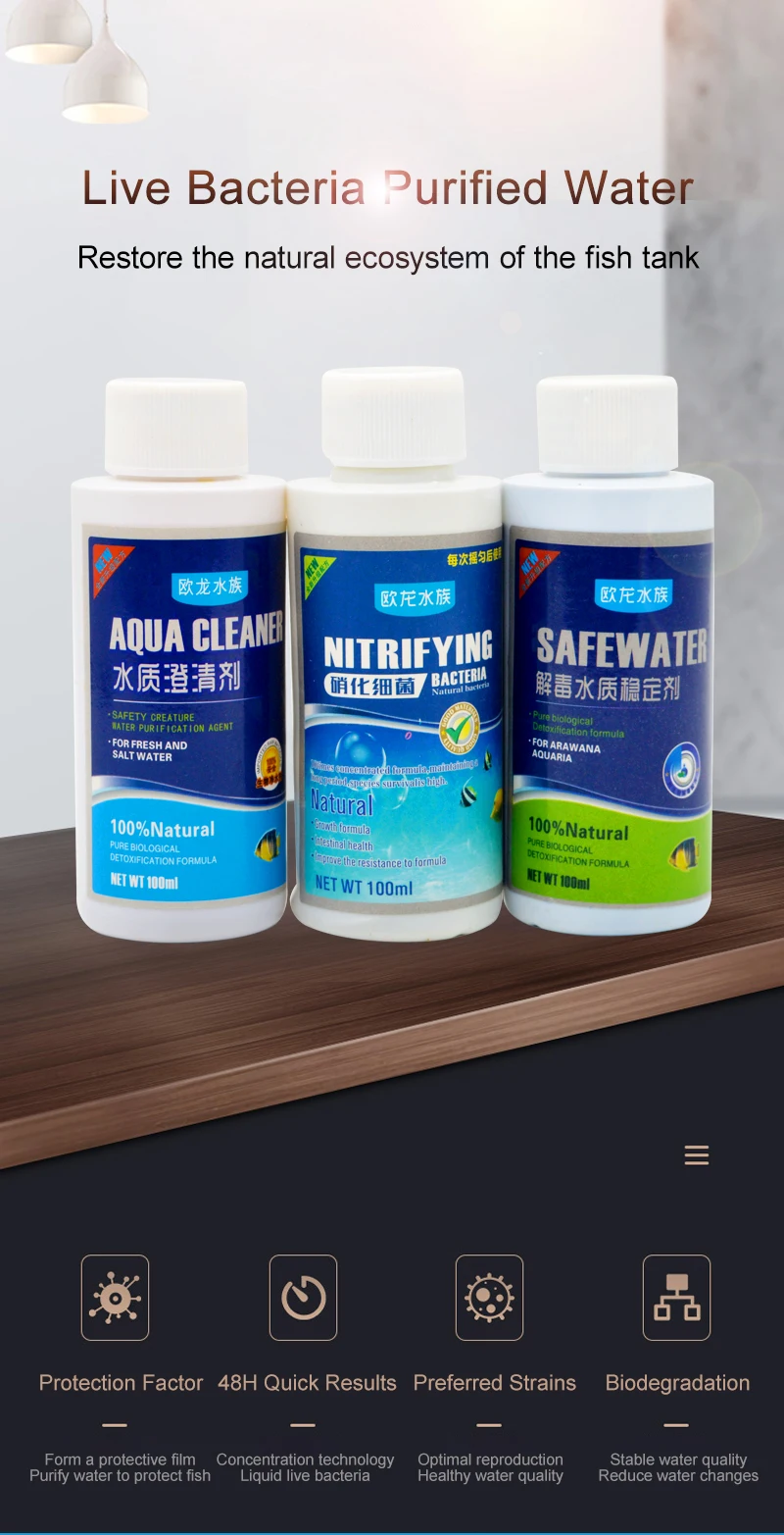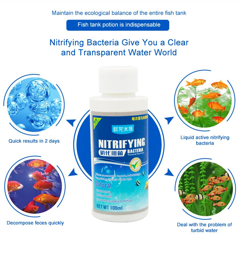 Этот продукт является живым микробным препаратом, содержащим большое количество живых нитритных бактерий. Азотирующие бактерии могут размножаться с помощью органических веществ в воде. Бактерии могут быстро разложить ионы аммиака и нитрита в аквариуме и преобразовать их в менее вредные ионы нитрата, которые изменяют качество воды и обеспечивают хорошую жизнь для окружающей среды декоративных рыб.