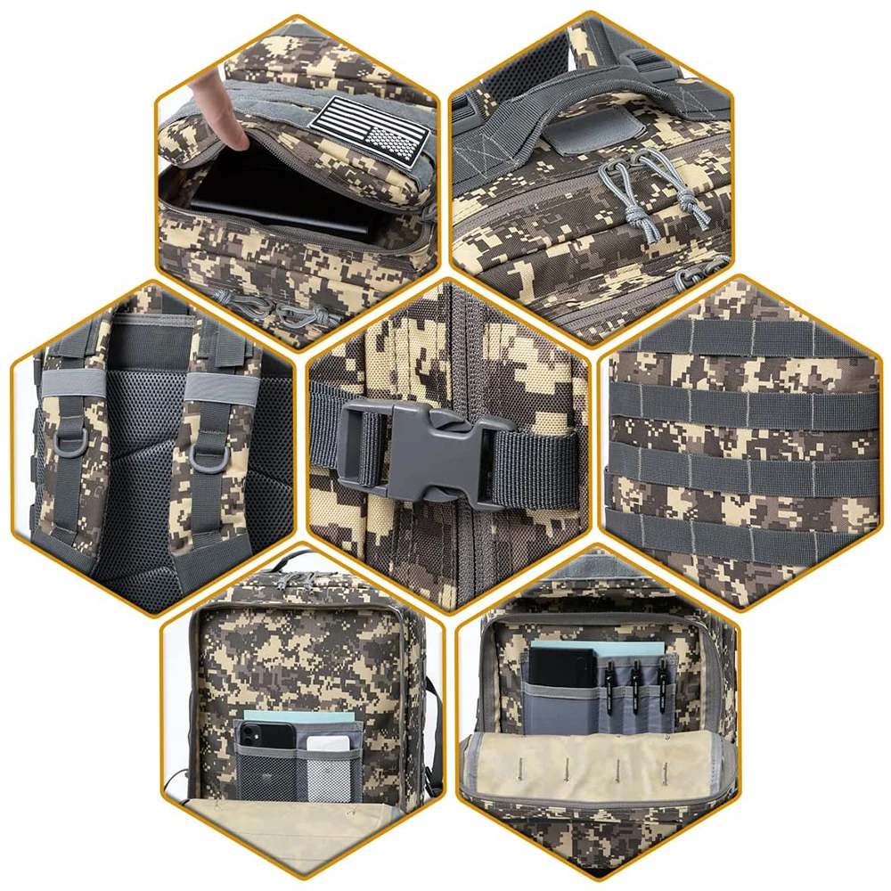 [Multi-functional and multi-compartment] The spacious military backpack has multiple compartments and double zipper closure pockets, including internal zipper pockets and mesh pockets, which increase storage options to meet your daily life and outdoor needs. 2 main large compartments, 2 front small compartments, and 1 rear compartment. The large compartment is equipped with elastic straps to fix the laptop or anything you don't want to move. Each compartment has mesh pockets or zipper pockets to help organize.
