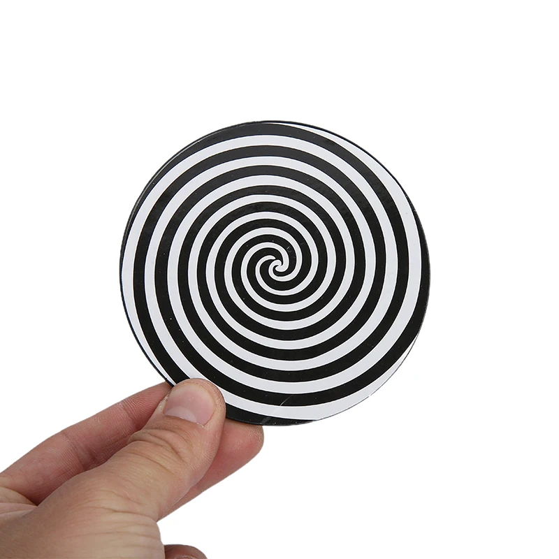 Волшебник отображает небольшой, специально сделанный спиральный стальной диск; Вообразите, какой гипнотист может использовать. Спираль закручивается на столешнице, и вы инструктируете зрителей смотреть на спираль и не смотреть вдаль. Вы начинаете считать обратную сторону от 10 до 1, и когда вы достигнете одного, вы скажите зрителям, чтобы посмотреть на свой нос.