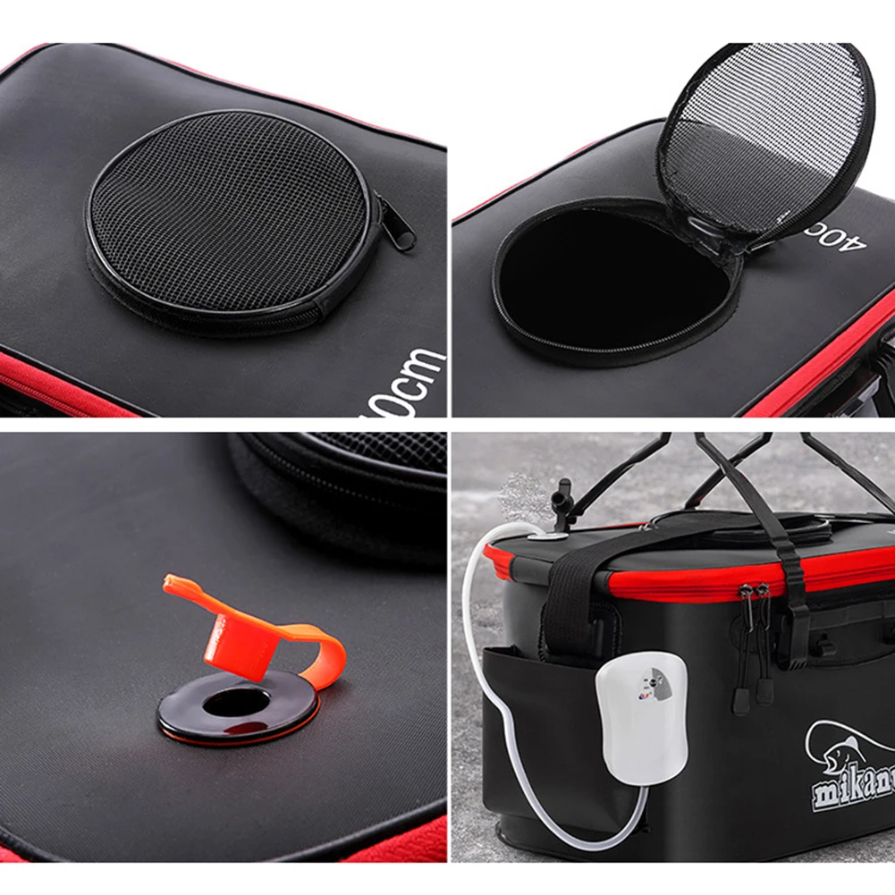 Хранение воды для кемпинга, пеших прогулок, а также для живой приманки, многофункциональные инструменты. Боковой карман для кислородного насоса, который сделает ваши рыбки дышащими, а сетчатая крышка делает более удобными, когда вы вставляете рыбы внутрь и наружу.