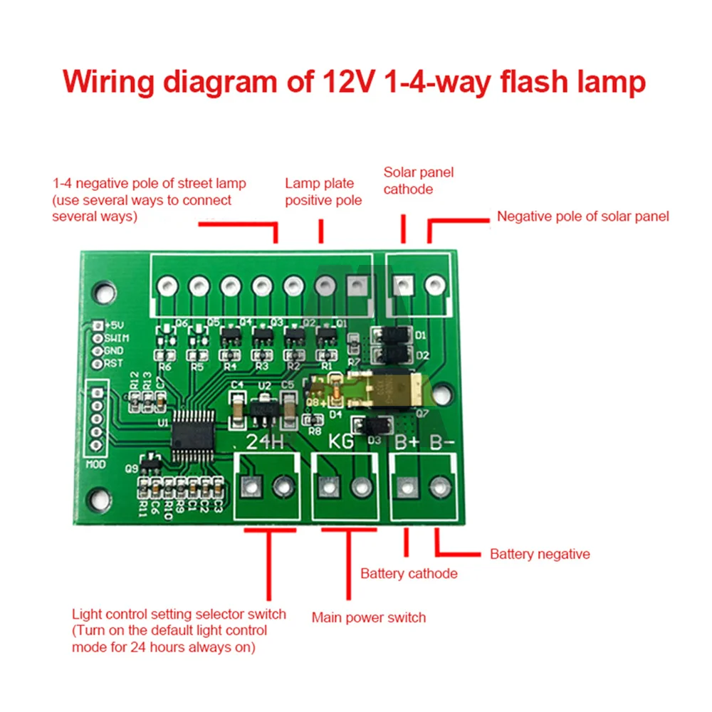 12V четырехканальный выход Солнечная вспыхивающая светильник схема. Максимальный ток на каждом выходе мигающий светильник не может превышать 1,5a. Постоянный светильник не может превышать 1 А.