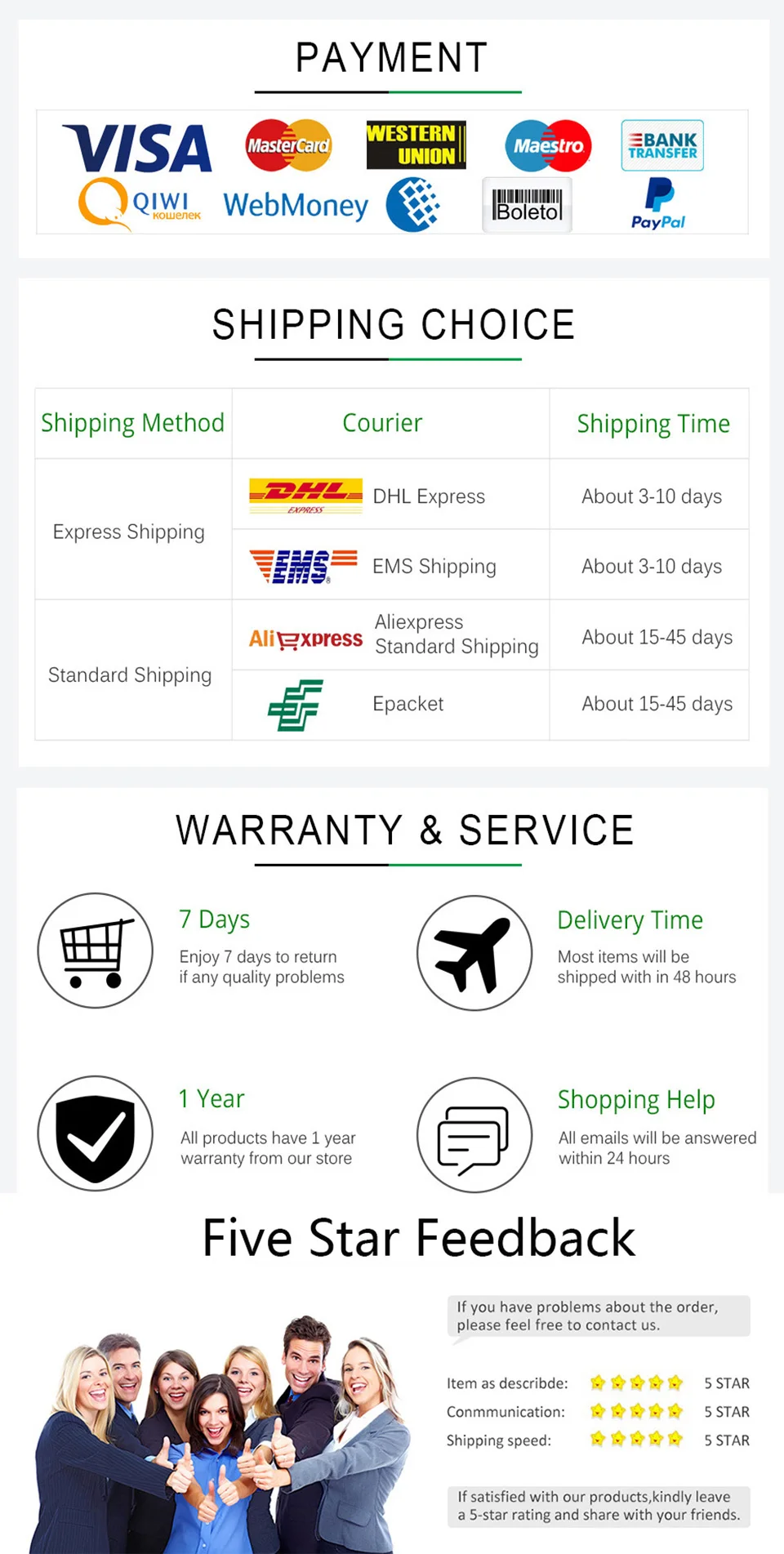 2) Если у вас есть какие-либо вопросы по обслуживанию или продукции, пожалуйста, свяжитесь с нами, мы будем искренне рады удовлетворить вас, это наша ответственность, пожалуйста, не оставляйте негативные отзывы, не связавшись с нами. Спасибо. Плохой обзор и спор не могут решить ничего.