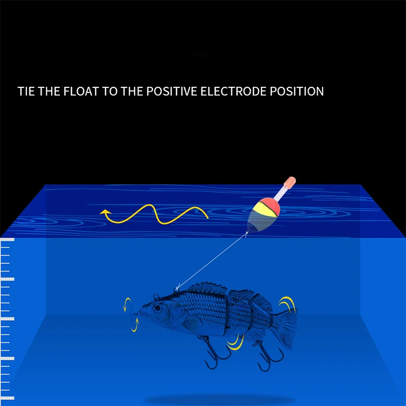 6. Поместите электронный сучковатые рыбы в воде в течение нескольких секунд и начать, светодиодный светильник будет светильник, и он перестанет кратко через 5-10 секунд, жду, когда добыча будет подключена. Когда электронная рыбка вынимается из воды, она выключится, и светодиодный светильник погаснет.