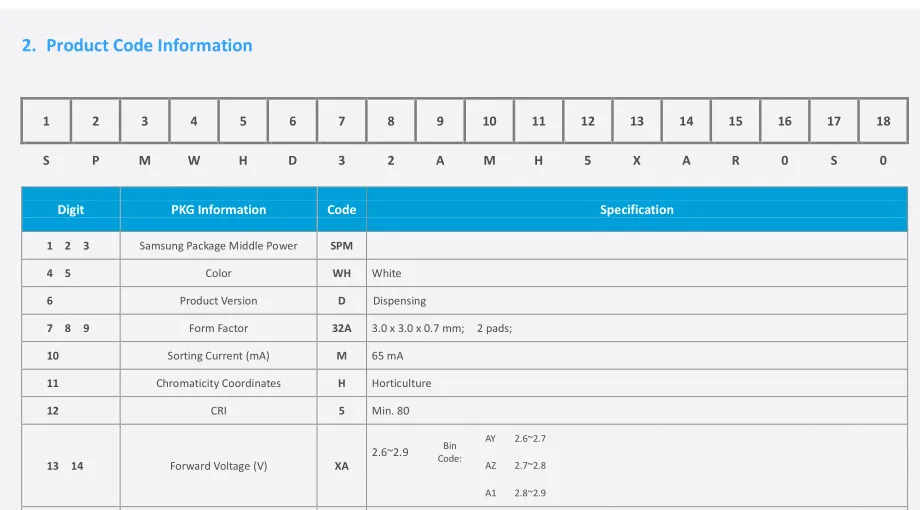 Samsung Led официальная Таблица параметров (опущенная часть)LM301H 3000-6500k