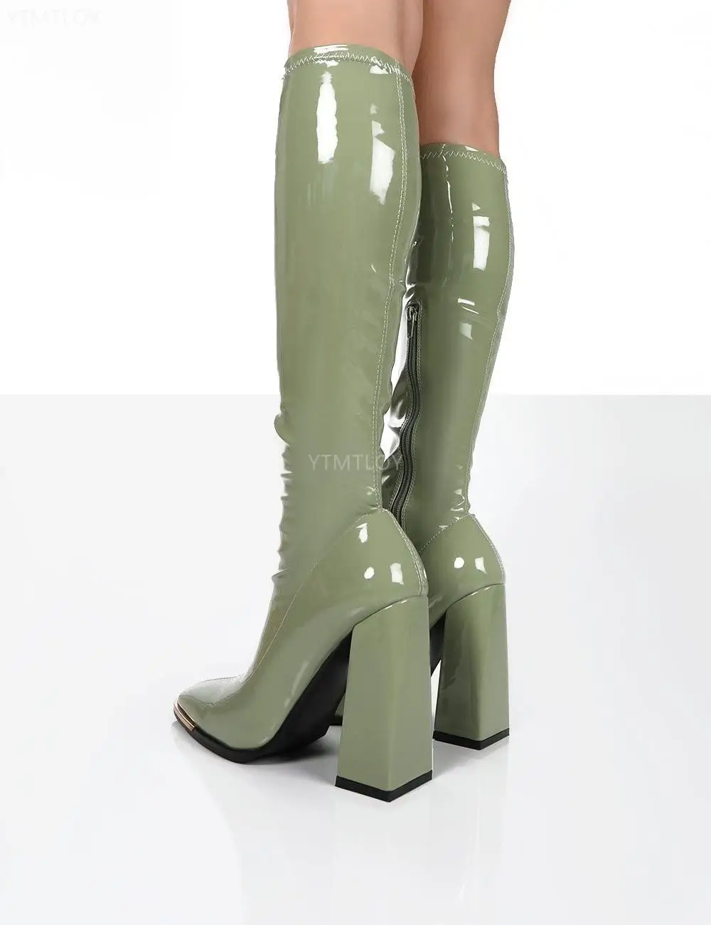 Женские ботинки на шнуровке черные эластичные с открытым носком высокие до бедра