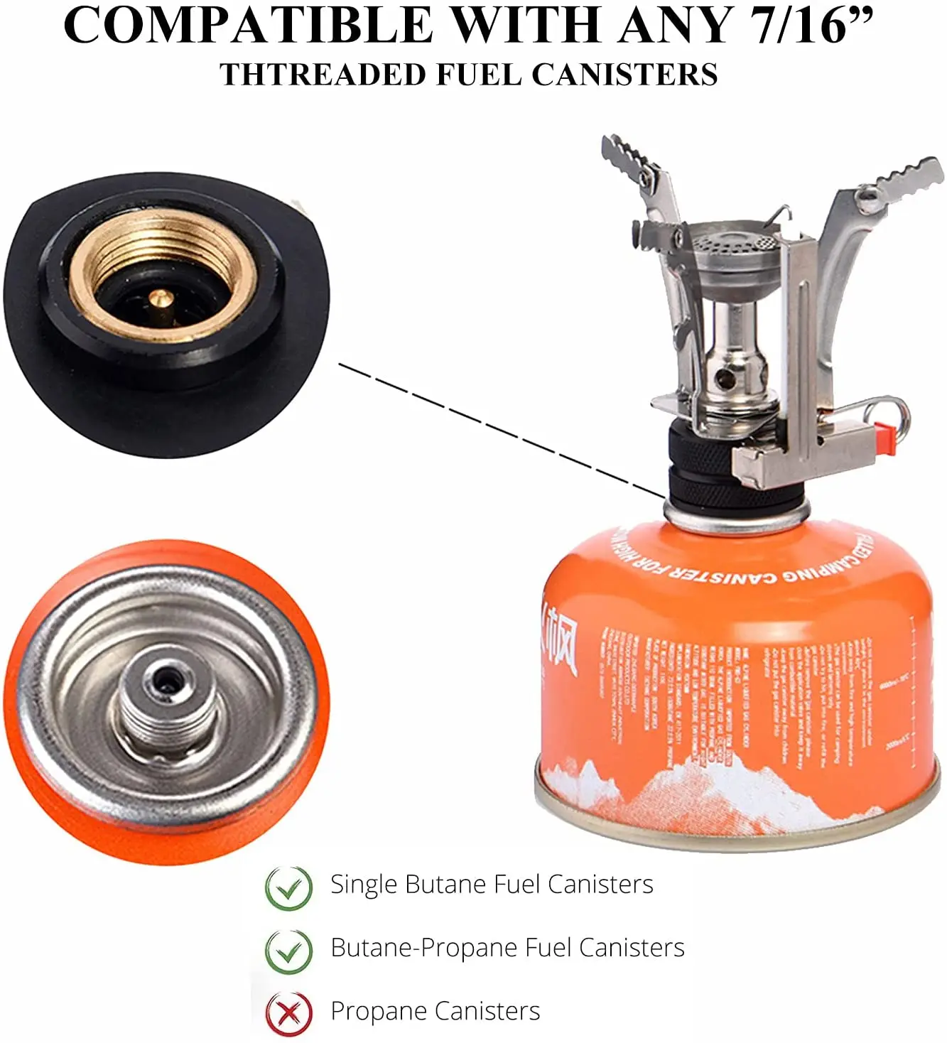 Совместим с любыми 7/16 резьбовыми одиночными бутановыми/бутановыми-пропановыми смешанными топливными канистрами (EN 417).