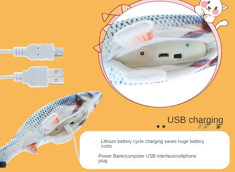 USB заряжается: эта игрушка заряжается от USB, что избавляет вас от хлопот и затрат на замену батарей. В посылка входит usb-кабель. Прилагаемый заряжаемый мотор отстегивается для удобной чистки плюшевой игрушки. Инструкции по использованию: расстегните живот рыбы, переверните переключатель, а затем нажмите на живот рыбы, чтобы сделать рыбу флоп