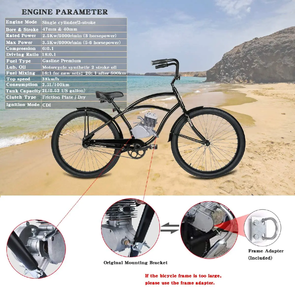 Режим двигателя:100CC, одноцилиндровый, с воздушным охлаждением, двухтактный