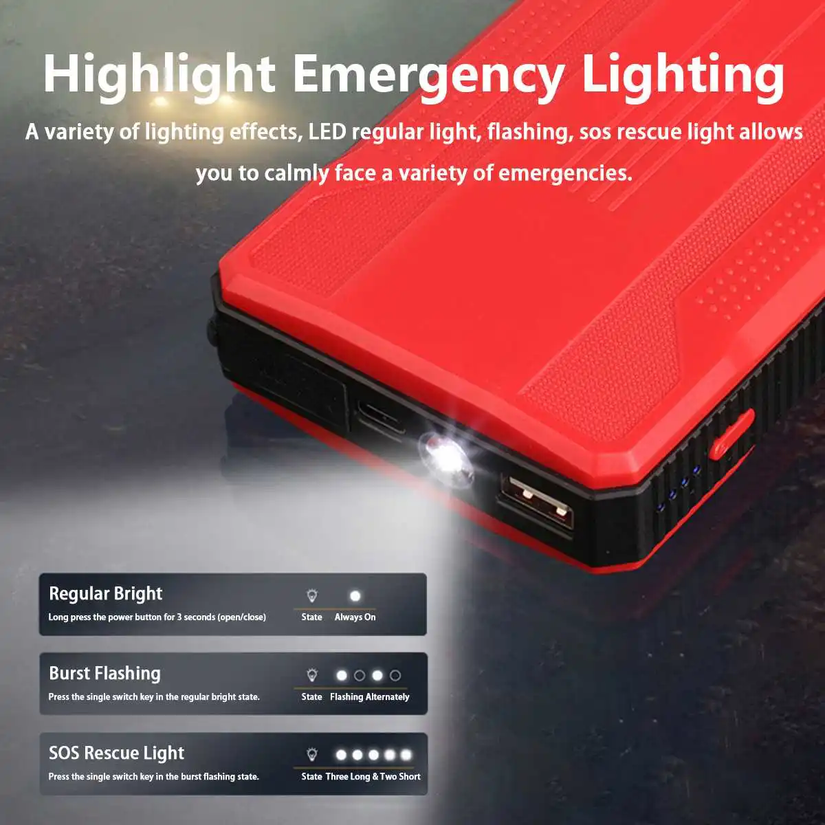 -3 режима освещения-фонарик, стробоскоп, SOS, этот автомобильный Стартовый Блок питания может работать как светодиодный фонарик, чтобы помочь вам увидеть ваш двигатель, сменить шину ночью, или даже предупредите встречное движение, когда вам нужна помощь на дороге.