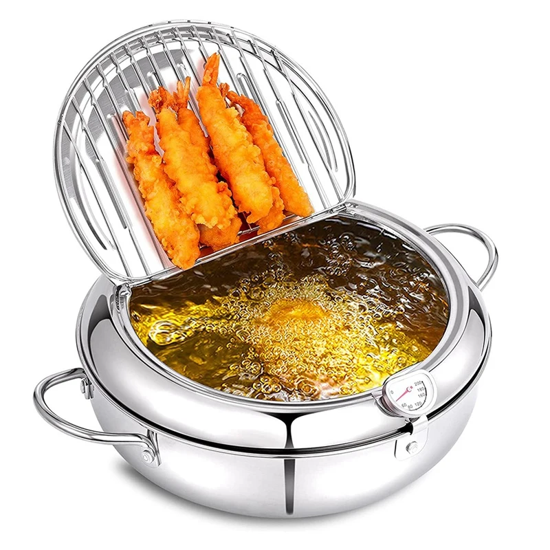 [Фритюрница из нержавеющей стали] фритюрница изготовлена из нержавеющей стали и долговечна и обладает хорошей теплоизоляцией. Он очень подходит для жарки (картофель фри, куриные Самородки, кальмарные кольца, темпура, креветки, арахис, рыба и т. д.) фритюрница совместима со всеми типами источников огня, включая пожарные источники газовой плиты, индукционной плиты, электрической плиты.