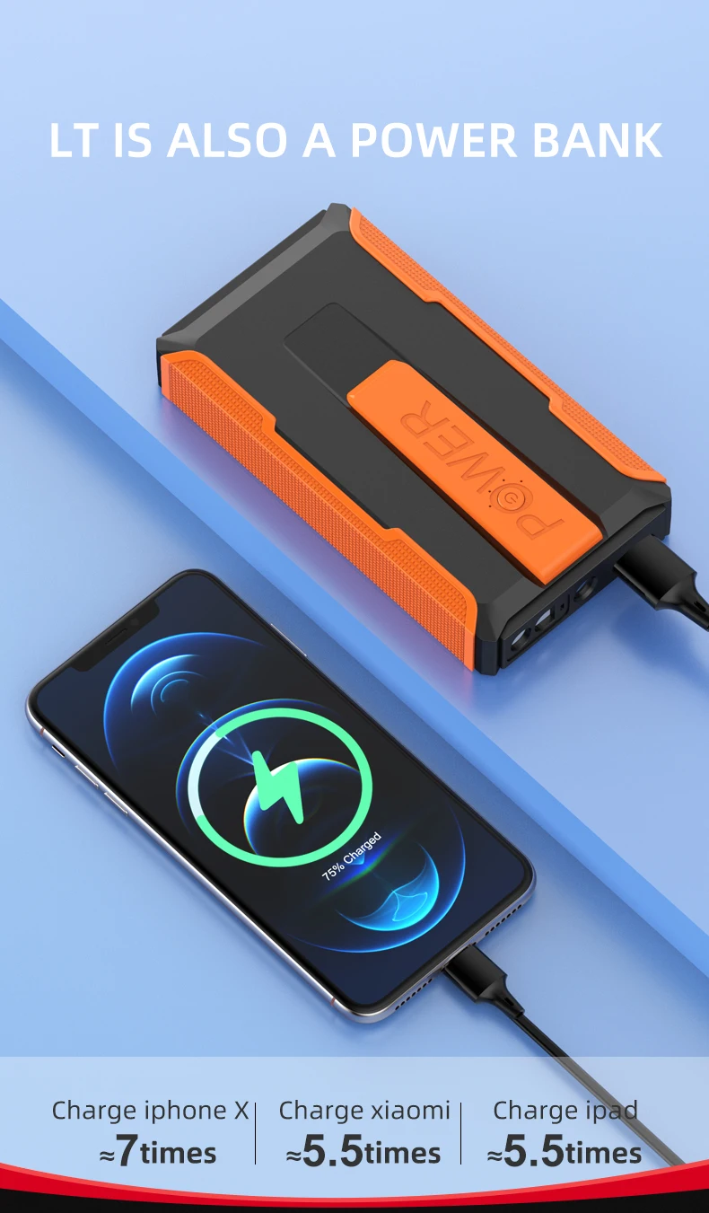 Аварийный источник питания не только используется для зажигания автомобиля, но также может использоваться как фонарик, мигающий свет и сигнал бедствия SOS.