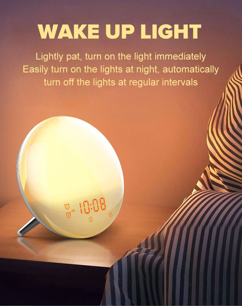 Будильник пробуждения поставляется с 7 видами звуков на выбор, чтобы проснуться с комфортом, такими как чистая музыка, птицы, лес, волны, звуковой сигнал и даже fm-радио опционально
