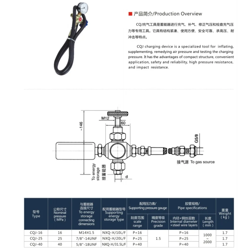 Высокое качество гидравлический аккумулятор зарядный аксессуар CQJ-16 CQJ-25 CQJ-40 резьба M14 * 1,5 CQJ Тип азот N2 Инструменты серии NXQ