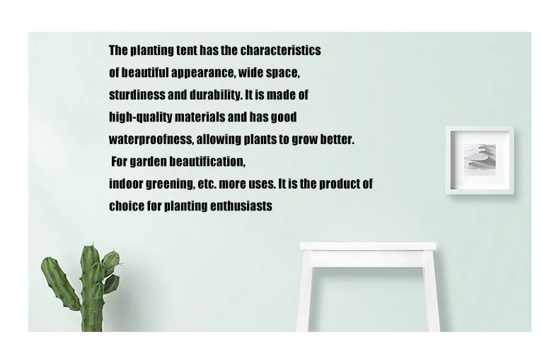 Материал изготовлен из высококачественных тканей, продукт гарантирован, и есть полное послепродажное обслуживание. Окно наблюдения предназначено для облегчения культивирования и наблюдения. Внутренняя рама поддерживается железными трубами, которые имеют высокую внутреннюю совместимость и могут использоваться с аксессуарами для выращивания. С вентиляционными отверстиями и дверцами для штор, легко убирать. Культивировать овощи, такие как: капуста, шпинат, рапса, капуста, амарант, лук, полынь, кориандр, горчичная зелень, капуста, фенхель, ростки чеснока, салат, водный шпинат и т. Д. После того, как семена произведены, они могут быть выполнены после достижения подходящей температуры на открытом воздухе. Большое количество посадки для удовлетворения потребностей собственного растительного разнообразия. Выращивание фруктов: клубника имеет низкую холодную толерантность, но она воспроизводит быстрее. В палатке для посадки большое количество клубничных корневых бутонов можно культивировать заранее (клубника в основном полагается на корни для прорастания), пересаживаемые после соответствующего сезона, И нужно только вернуться после сезона. Сохраните 7-8 растений в ТЕНТЕ для посадки. Цветы могут быть высажены на больших площадях после выращивания семян в посадочных палатках, то же самое относится и к другим декоративным растениям.