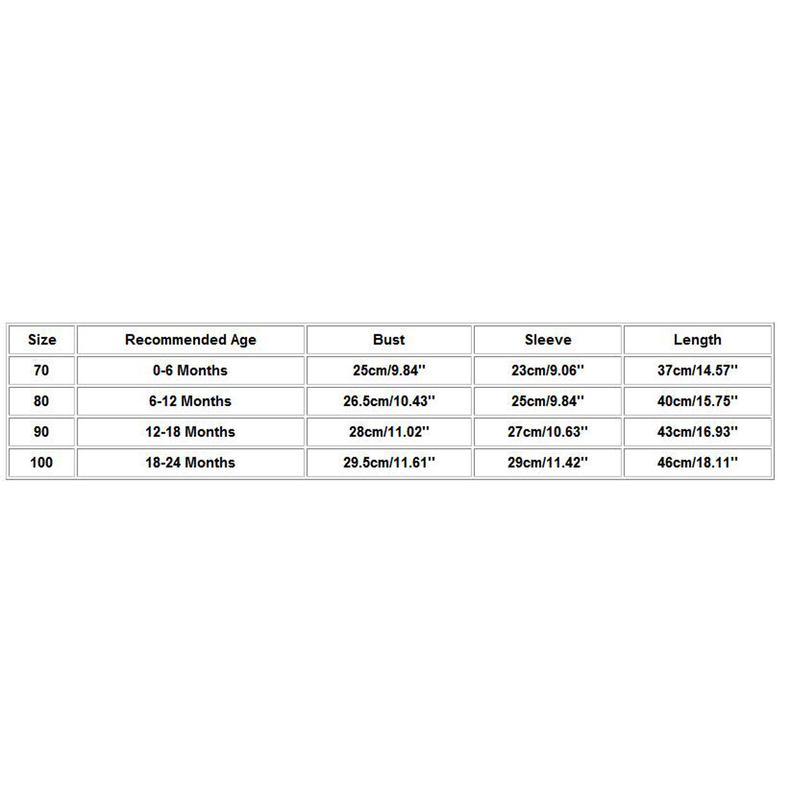| Размеры | Рекомендуемый возраст | Бюст | Рукав | Длина |