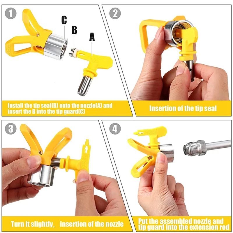 Просто работайте: это займет несколько минут, чтобы собрать эти инструменты для распыления краски, вам нужно вставить наконечник уплотнения на защитное основание, И вставьте распылительную насадку и поверните, чтобы завершить шаги установки, а затем поверните на удлинитель опрыскивателя