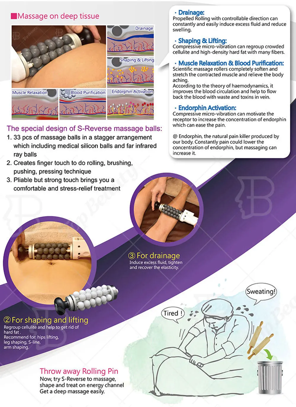 Подвижное движение сфер позволяет отделить адипоциты, которые отвечают за волокнистую ткань, которая вызывает апельсиновую кожуру кожи. Эффект; Уменьшает дефект красоты после нескольких занятий.