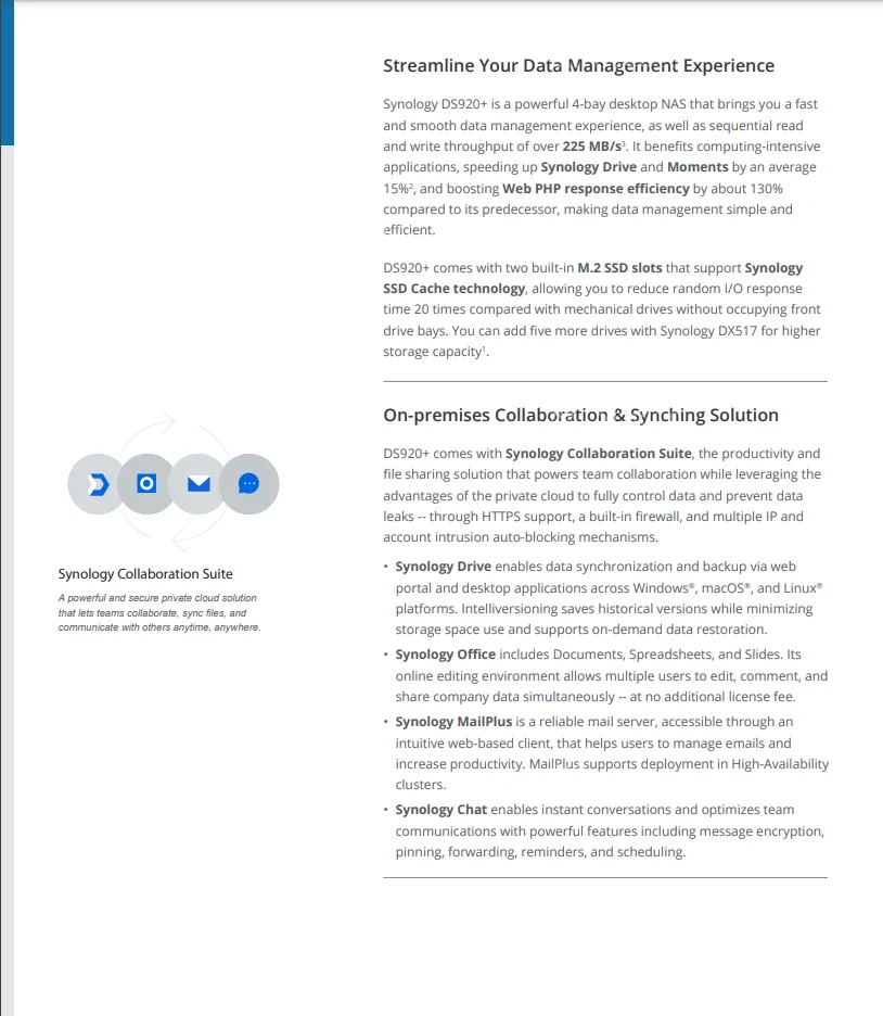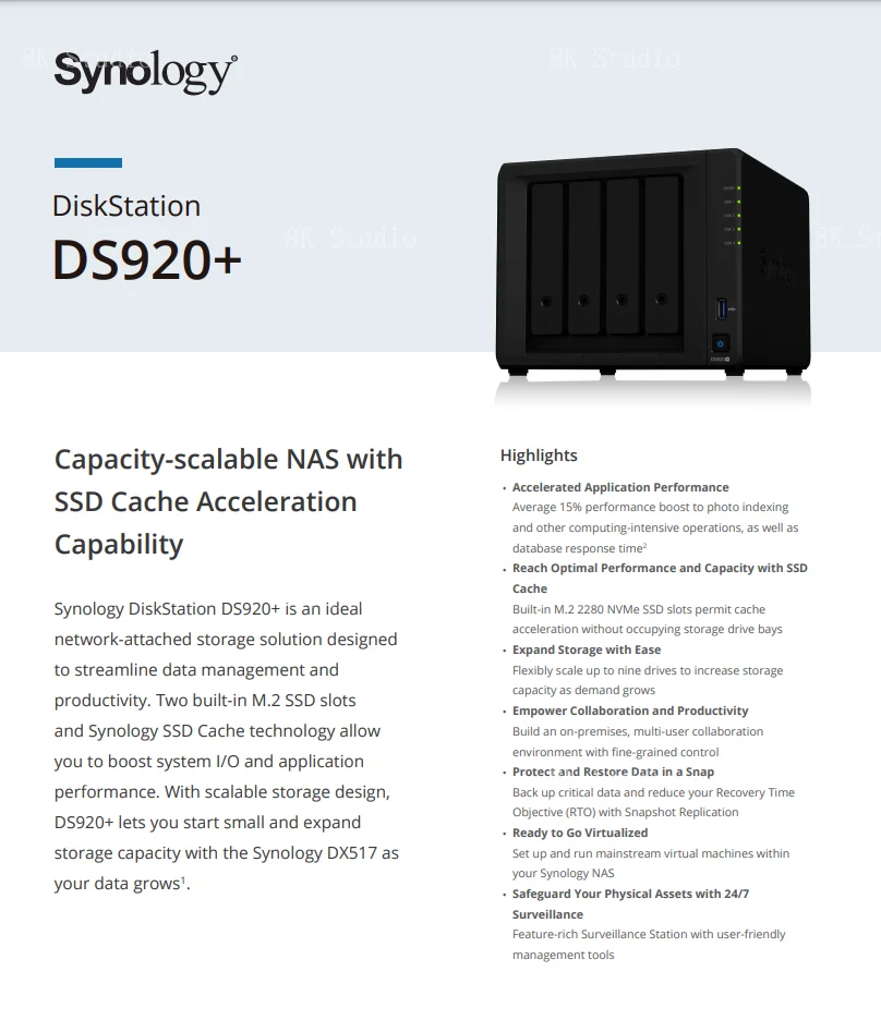 DS920 + обеспечивает два встроенных слота M.2 SSD, чтобы вы могли в полной мере воспользоваться функциями Synology SSD Cache. Добавьте кэш SSD до 20 раз быстрее ввода/вывода без использования отсеков переднего диска. Вы можете добавить еще пять дисков с Synology DX517 для увеличения емкости памяти.