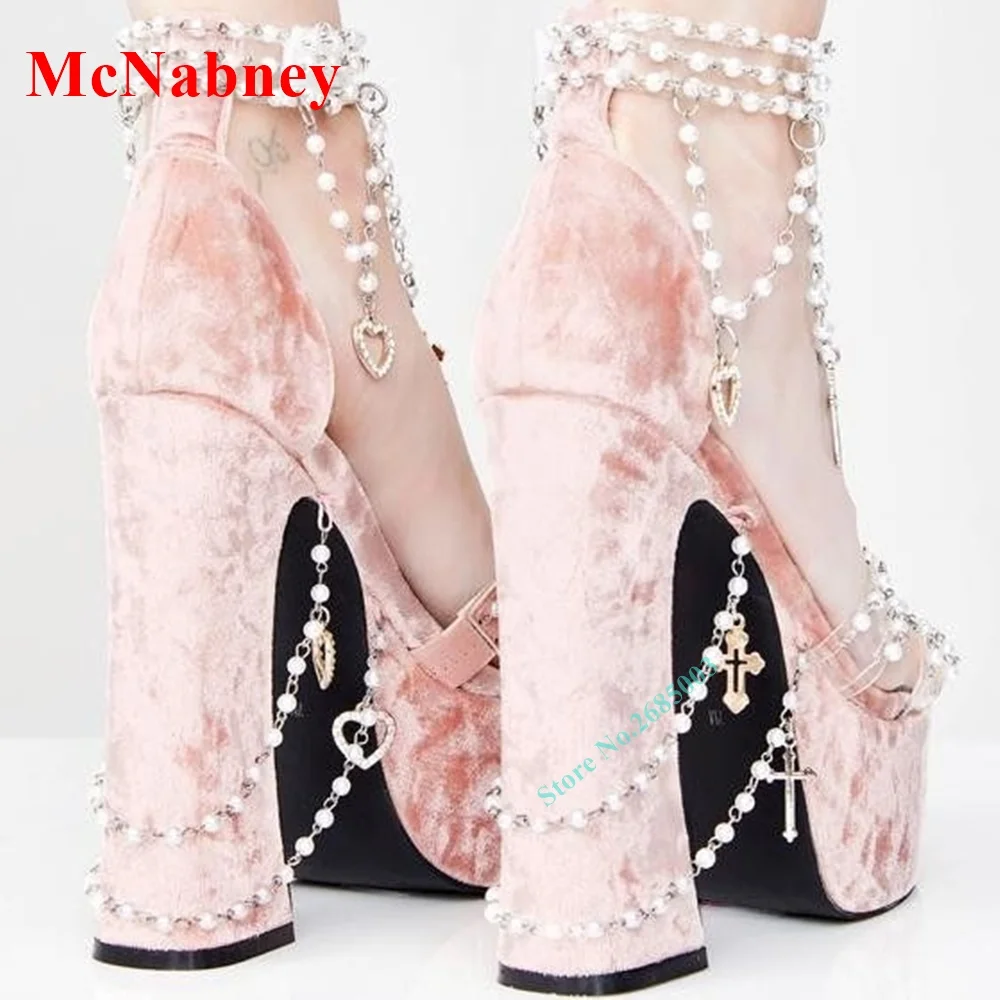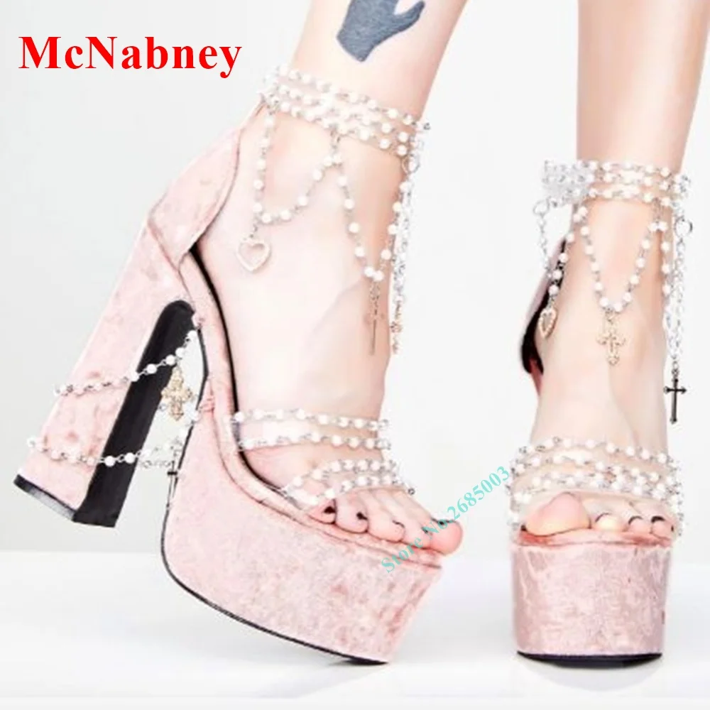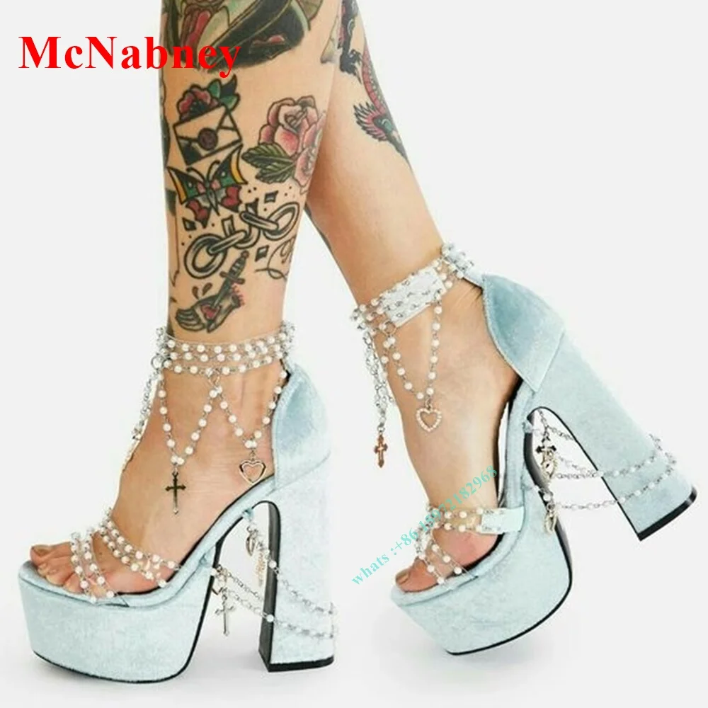 Наименование товара: пикантные босоножки с ЖЕМЧУЖНОЙ БАХРОМОЙ и цепочкой; Замшевые открытые босоножки с открытым носком на не сужающемся книзу массивном каблуке и платформе; Женская обувь; Летнее праздничное платье; Стиль «липучка»