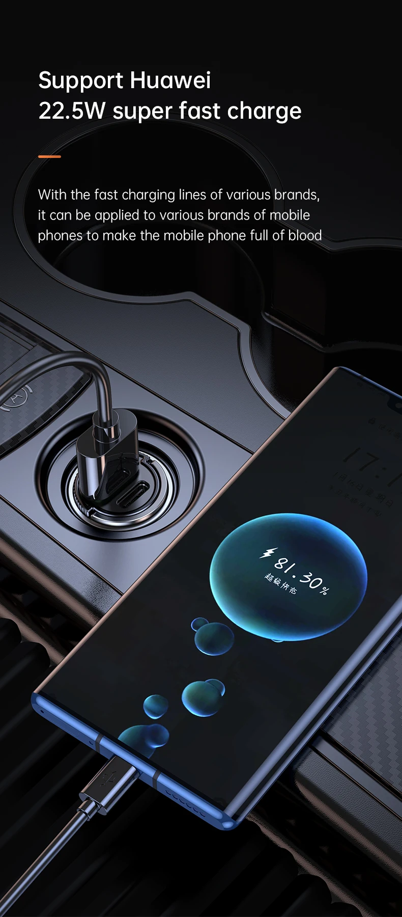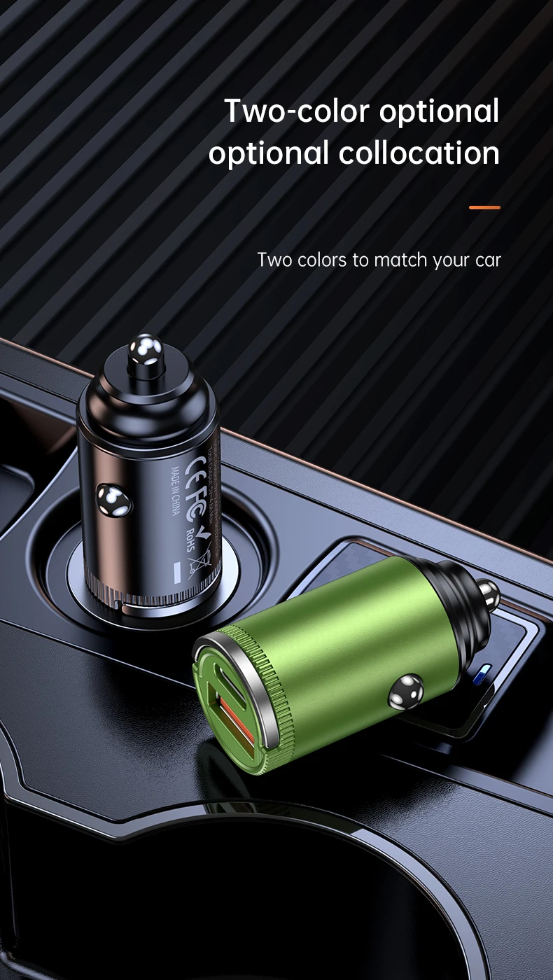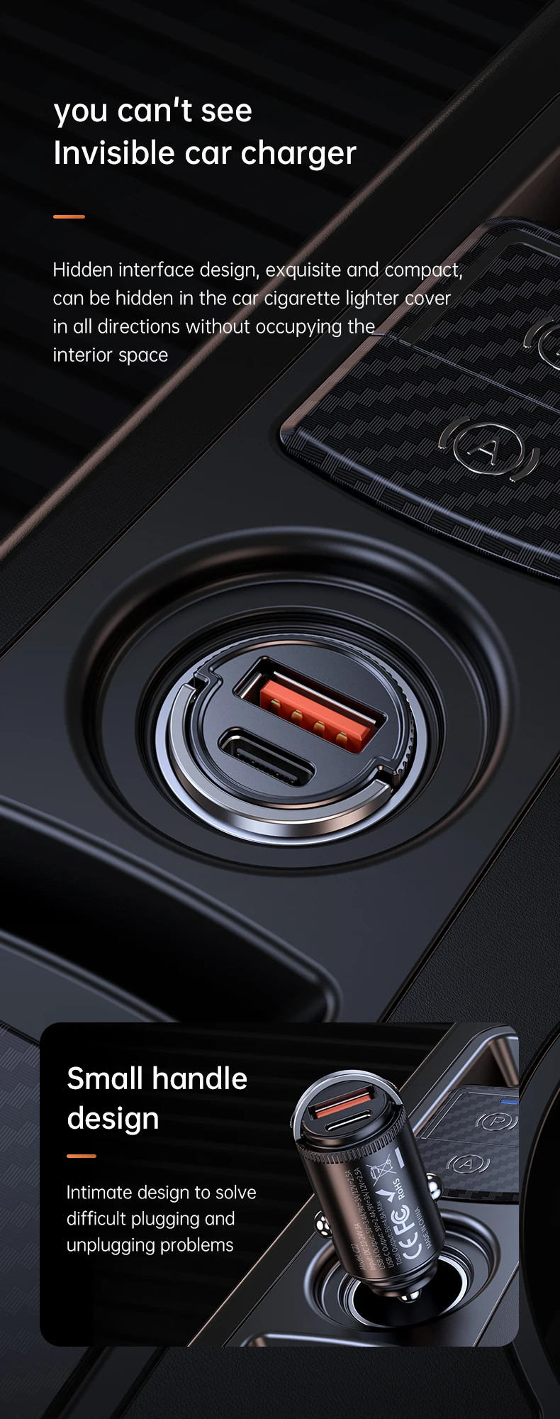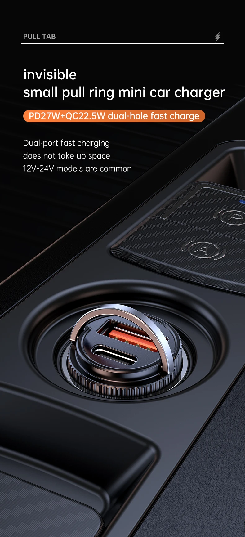 1: Мини Автомобильное зарядное устройство из цинкового сплава, небольшой выдвижной кольцевой дизайн PD27w + QC22.5w двойное отверстие, быстрое зарядное устройство, скрытый разъем