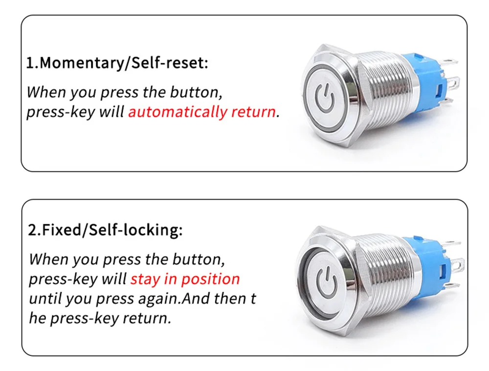 1.Momentary/Self-reset: When you press the button, press-key will automatically return.(Like a car horn switch.Press it-power on, release it-power off.)