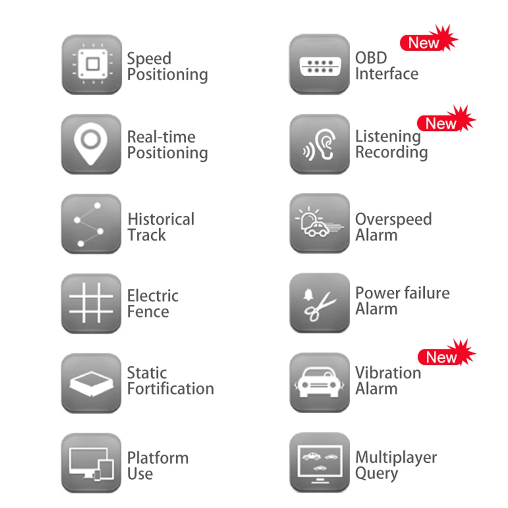 * 5. Функции: позиционирование в реальном времени, оповещение о превышении скорости, вибрационная сигнализация, будильник о перемещении, обнаружение статуса ACC.
