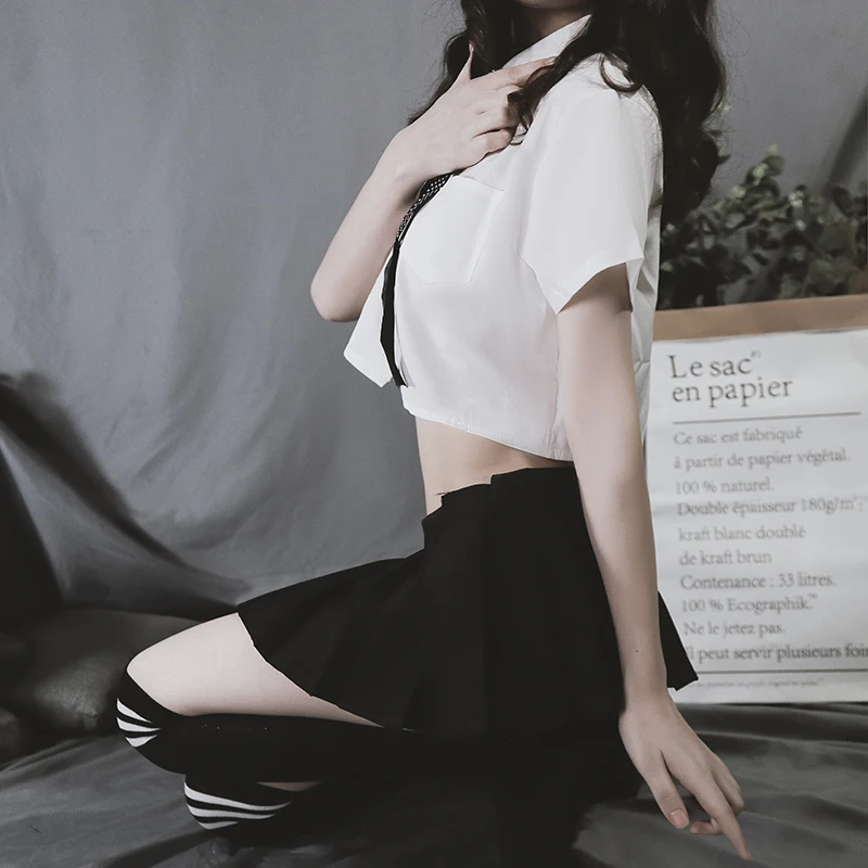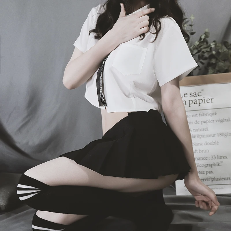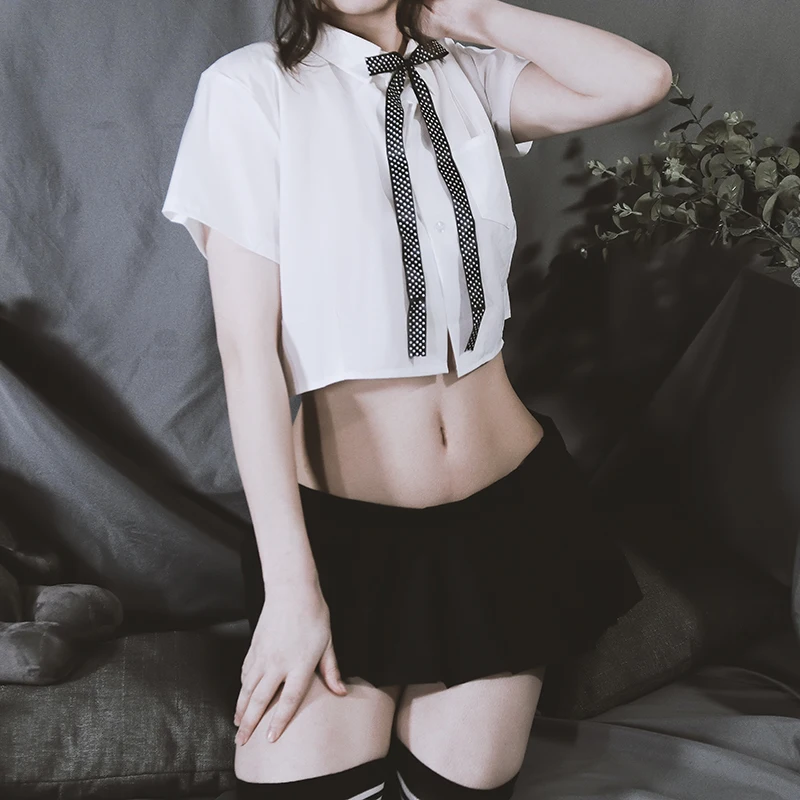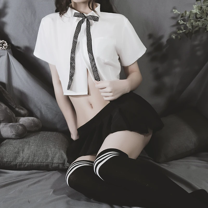 Включает: мини-юбка + блузка + Т-образная спинка + галстук-бабочка + (с чулками или нет, зависит от вашего выбора)
