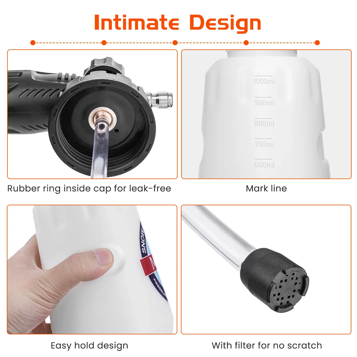 【Humanized дизайн ①с фильтром на конце трубки, фильтрующие частицы в мыле или воде, никогда не царапают автомобильную краску. ②Утопленная область бутылки для удобства хранения. ③ Резиновое кольцо внутри крышки без протечек.