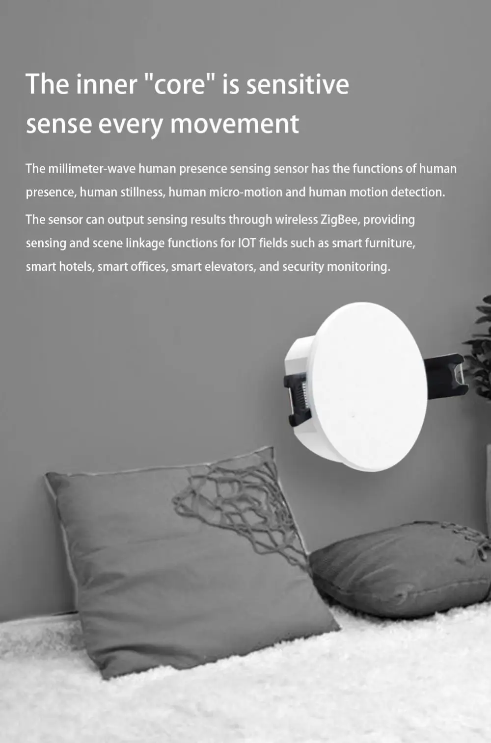 Датчик присутствия человека использует принцип радиолокационной микроволновой печи и имеет функции человеческого присутствия, человеческой неподвижности, человеческого микро-движения и обнаружения человеческого движения.