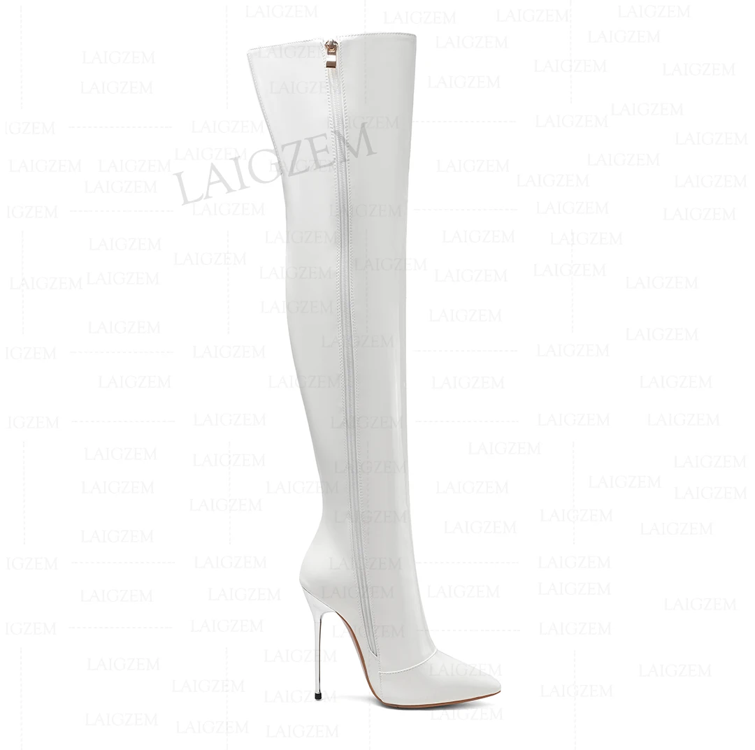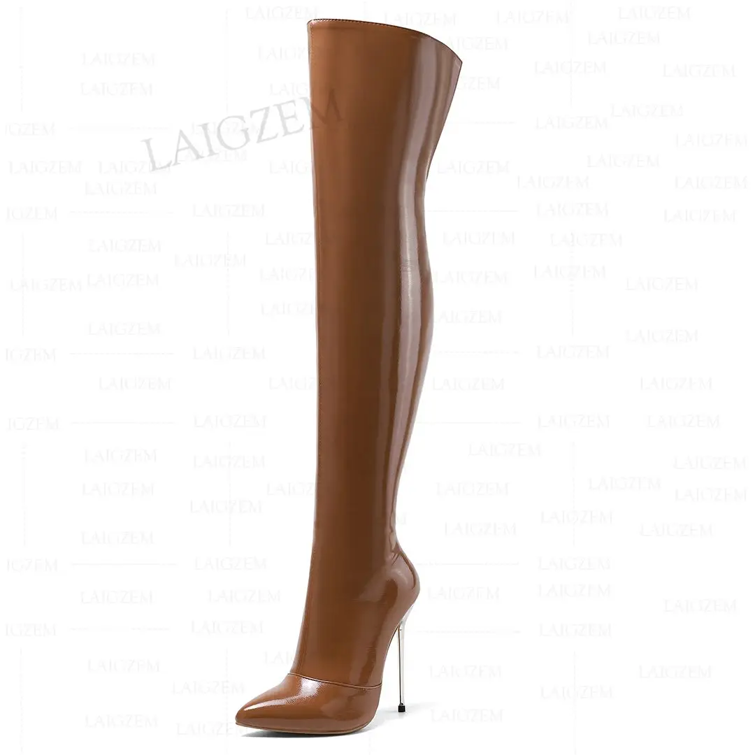 LAIGZEM/Женские Сапоги выше колена; Сапоги с острым носком, на молнии сбоку, на металлическом каблуке; Женская обувь; Botas Mujer; Женская обувь; Большие размеры 33, 43, 46