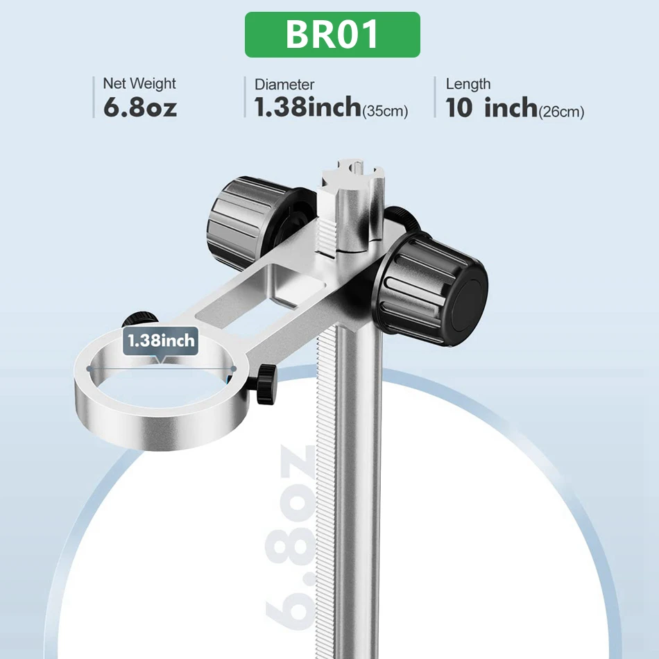 В BR01 микроскоп Удлинительный кронштейн поставляется с 1,38 "держатель, которая совместима с USB цифровой микроскоп и большую часть ЖК-дисплей цифровой микроскопы (max 1,4 дюйма в диаметре)