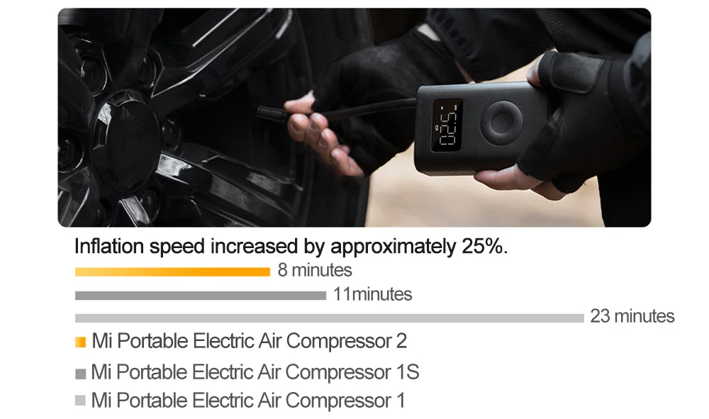 Благодаря мощному магнитному двигателю он может заполнить одну пустую шину всего за 8 минут *. Инфляция является более мощной. Скорость инфляции увеличилась примерно на25%.