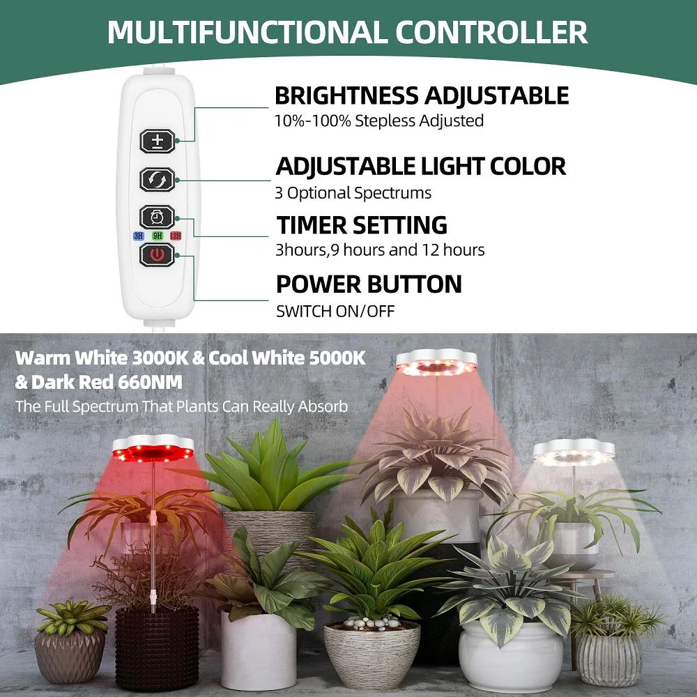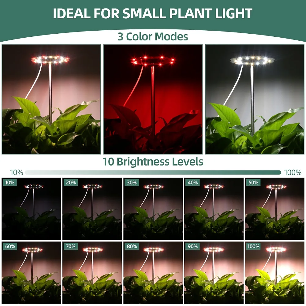 【Регулируемая высота и 10 регулируемых уровнейНебольшой светильник для выращивания поставляется с 3 трубами и пластиковым заземлением, легко вставляется в почву. Растительная лампа для комнатных растений покрывает 0-35 дюймовый диапазон высоты растений. Также большая площадь или больше растений будет покрыта, когда лампа для выращивания находится поверх полюса. Растительный светильник для комнатных растений может обеспечить 10 уровней яркости от 10% до 100%. Вы можете обеспечить различные уровни яркости для ваших комнатных растений на разных этапах их роста.