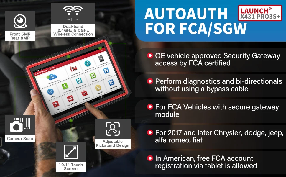 Используйте последнюю функцию обновления программного обеспечения AutoAuth для обеспечения диагностики OBDII, активного тестирования, калибровки и т. д. для современных транспортных средств FCA/SGW, что делает диагностику более безопасной. Применимо к транспортным средствам FCA, оснащенным модулем шлюза безопасности (SGW) в 2017 году и позже (Примечание: FCA Americas можно зарегистрировать и использовать d бесплатно, Европейский регион требует покупки)